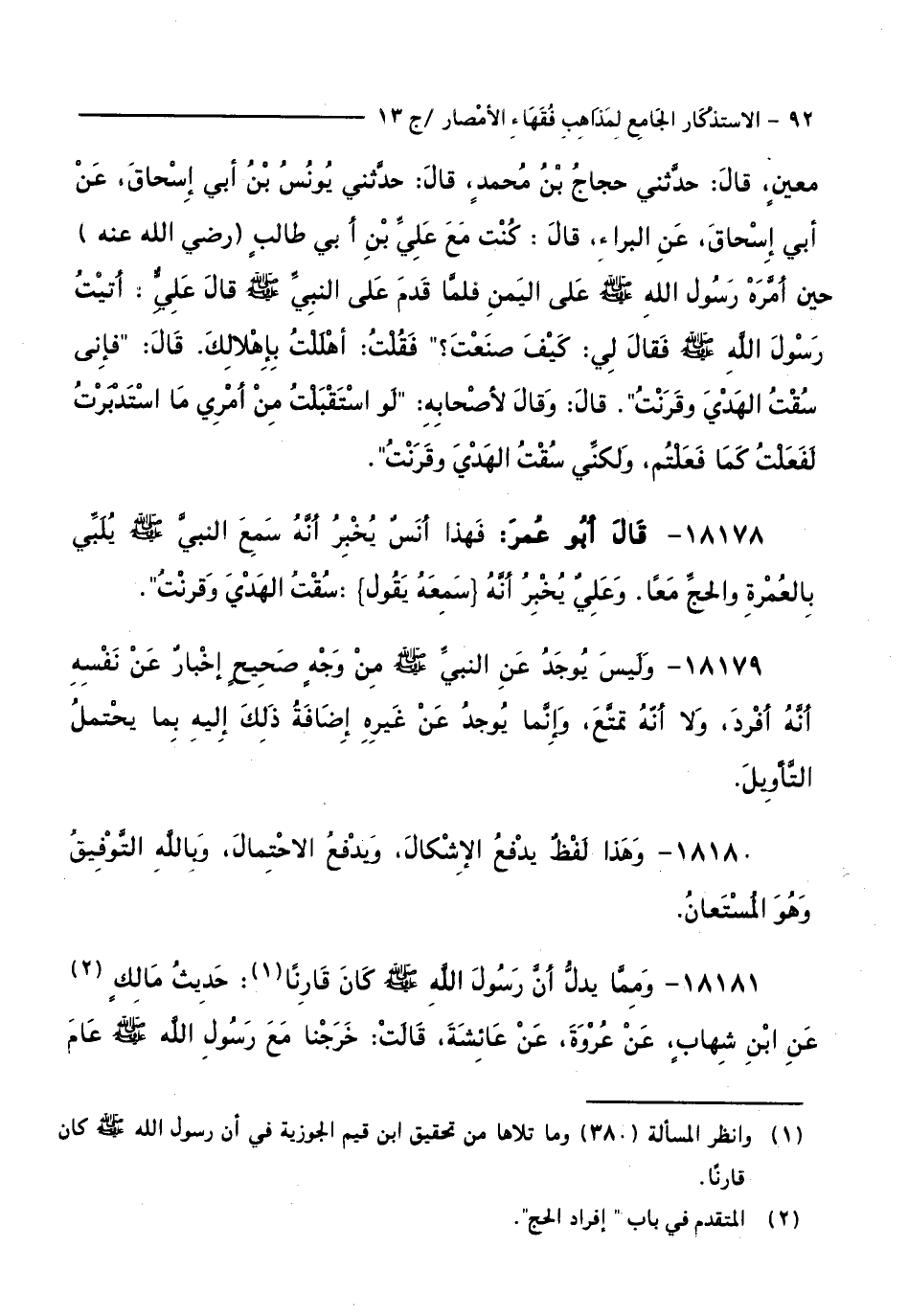 18178 - قَالَ أَبُو عُمَرَ: فَهَذَا أَنَسٌ يُخْبِرُ أَنَّهُ سَمِعَ النَّبِيَّ - صَلَّى اللَّهُ عَلَيْهِ وَسَلَّمَ - يُلَبِّي بِالْعُمْرَةِ وَالْحَجِّ مَعًا. وَعَلِيٌّ يُخْبِرُ أَنَّهُ سَمِعَهُ يَقُولُ: سُقْتُ الْهَدْيَ وَقَرَنْتُ ".
