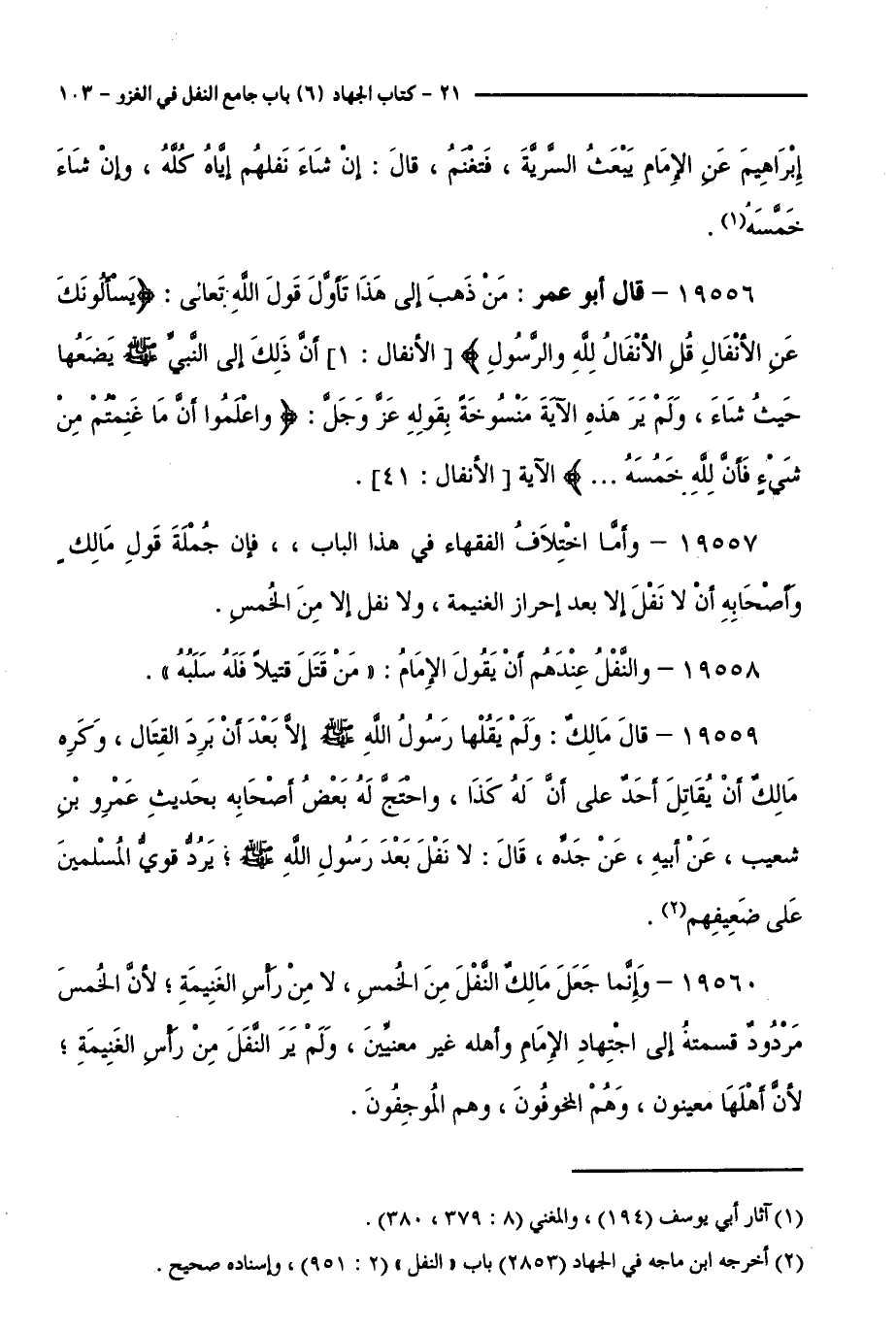 19557 - وَأَمَّا اخْتِلَافُ الْفُقَهَاءِ فِي هَذَا الْبَابِ، فَإِنَّ جُمْلَةَ قَوْلِ مَالِكٍ وَأَصْحَابِهِ أَلَّا نَفْلَ إِلَّا بَعْدَ إِحْرَازِ الْغَنِيمَةِ، وَلَا نَفْلَ إِلَّا مِنَ الْخُمُسِ.
