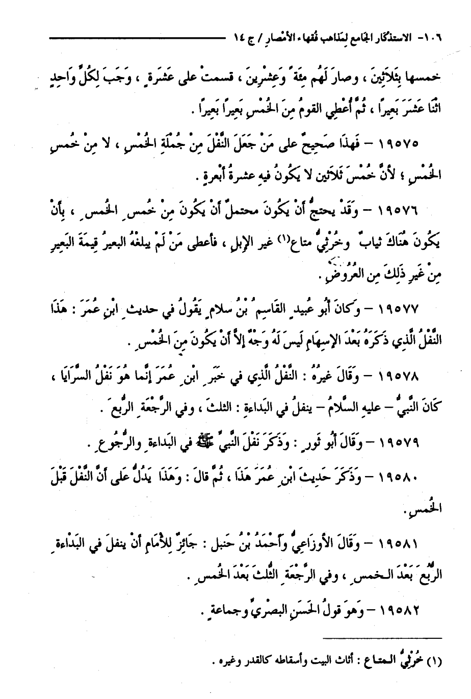 19578 - وَقَالَ غَيْرُهُ: النَّفْلُ الَّذِي فِي خَبَرِ ابْنِ عُمَرَ إِنَّمَا هُوَ نَفْلُ السَّرَايَا، كَانَ النَّبِيُّ - عَلَيْهِ السَّلَامُ - يَنْفُلُ فِي الْبَدَاءَةِ وَالرُّجُوعِ.