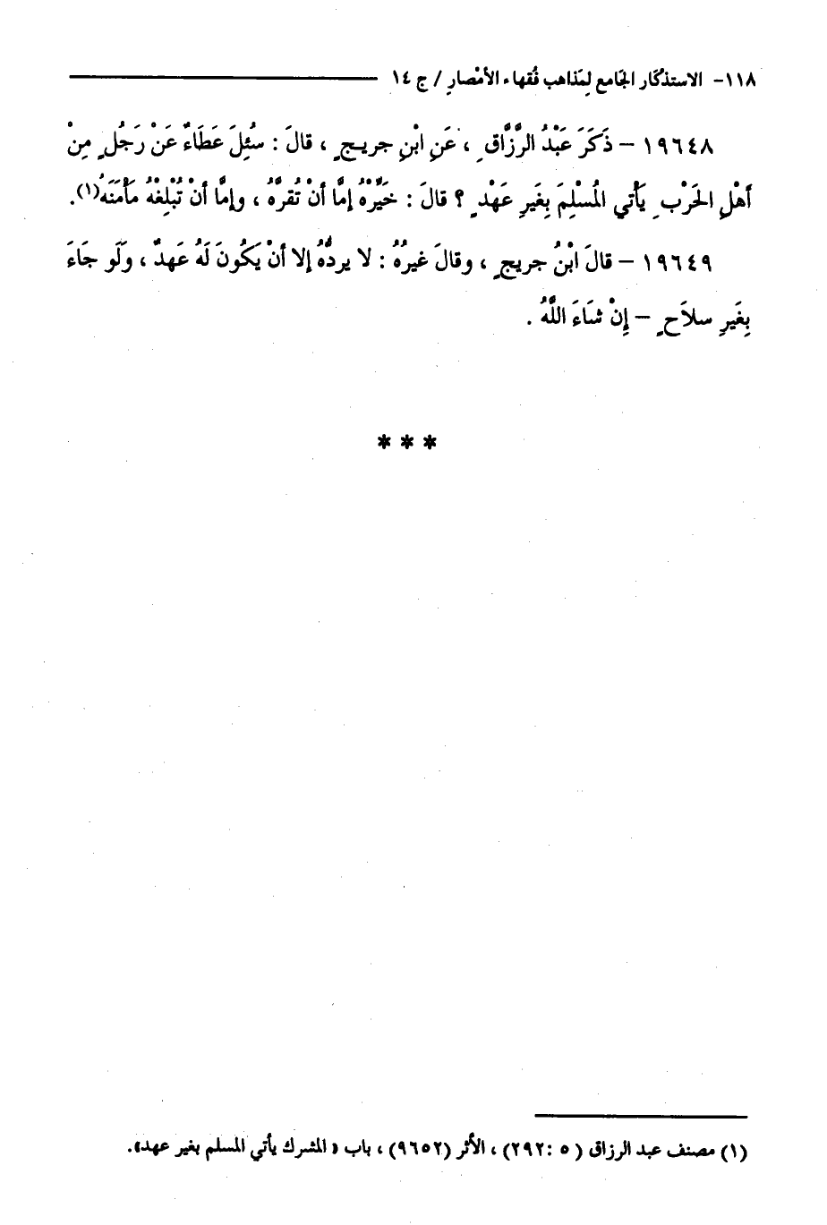 19648 - ذَكَرَ عَبْدُ الرَّزَّاقِ، عَنِ ابْنِ جُرَيْجٍ، قَالَ: سُئِلَ عَطَاءٌ عَنْ رَجُلٍ مِنْ أَهْلِ الْحَرْبِ يَأْتِي الْمُسْلِمَ بِغَيْرِ عَهْدٍ ؟ قَالَ: خَيِّرْهُ إِمَّا أَنْ تُقِرَّهُ، وَإِمَّا أَنْ تُبَلِّغْهُ مَأْمَنَهُ.
