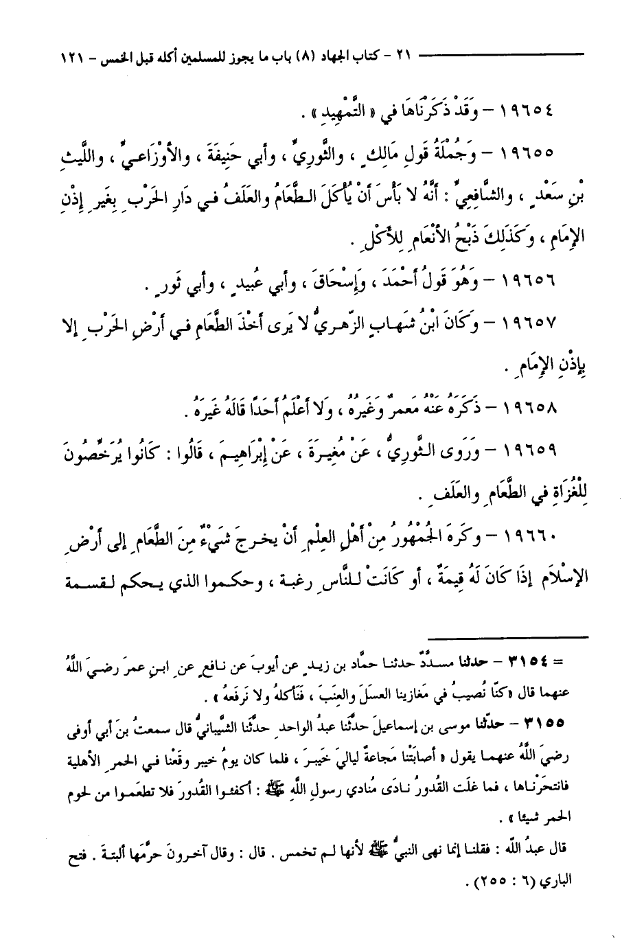 19657 - وَكَانَ ابْنُ شِهَابٍ الزُّهْرِيُّ لَا يَرَى أَخْذَ الطَّعَامِ فِي أَرْضِ الْحَرْبِ إِلَّا بِإِذْنِ الْإِمَامِ 19658 - ذَكَرَهُ عَنْهُ مَعْمَرٌ وَغَيْرُهُ، وَلَا أَعْلَمُ أَحَدًا قَالَهُ غَيْرَهُ.