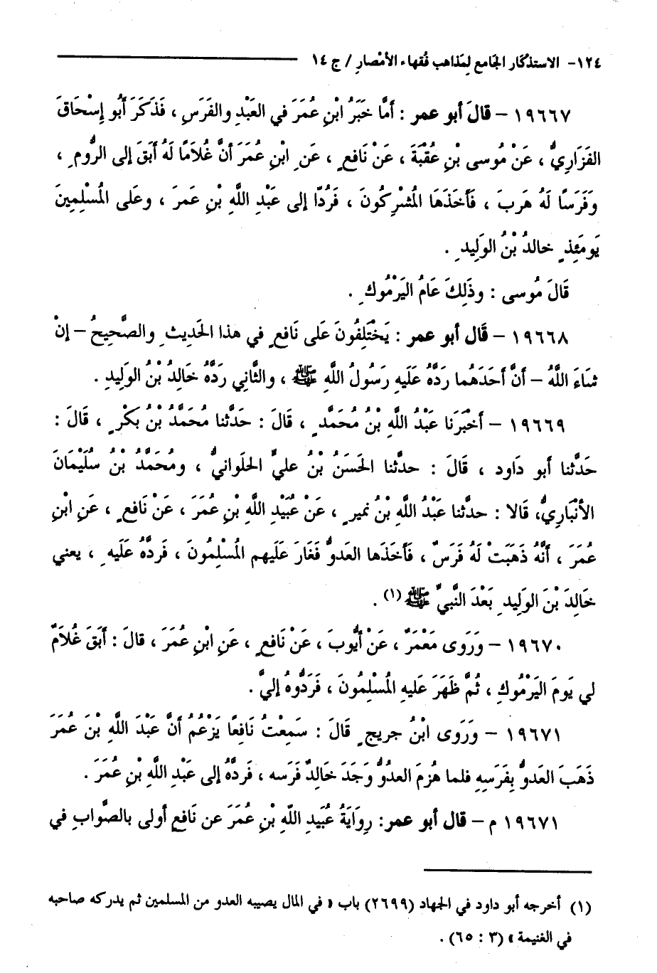 19667 - قَالَ أَبُو عُمَرَ: أَمَّا خَبَرُ ابْنِ عُمَرَ فِي الْعَبْدِ وَالْفَرَسِ، فَذَكَرَ أَبُو إِسْحَاقَ الْفَزَارِيُّ، عَنْ مُوسَى بْنِ عُقْبَةَ عَنْ نَافِعٍ، عَنِ ابْنِ عُمَرَ أَنَّ غُلَامًا لَهُ أَبَقَ إِلَى الرُّومِ، وَفَرَسًا لَهُ هَرَبَ، فَأَخَذَهَا الْمُشْرِكُونَ، فَرُدَّا إِلَى عَبْدِ اللَّهِ بْنِ عُمَرَ، وَعَلَى الْمُسْلِمِينَ يَوْمَئِذٍ خَالِدُ بْنُ الْوَلِيدِ.