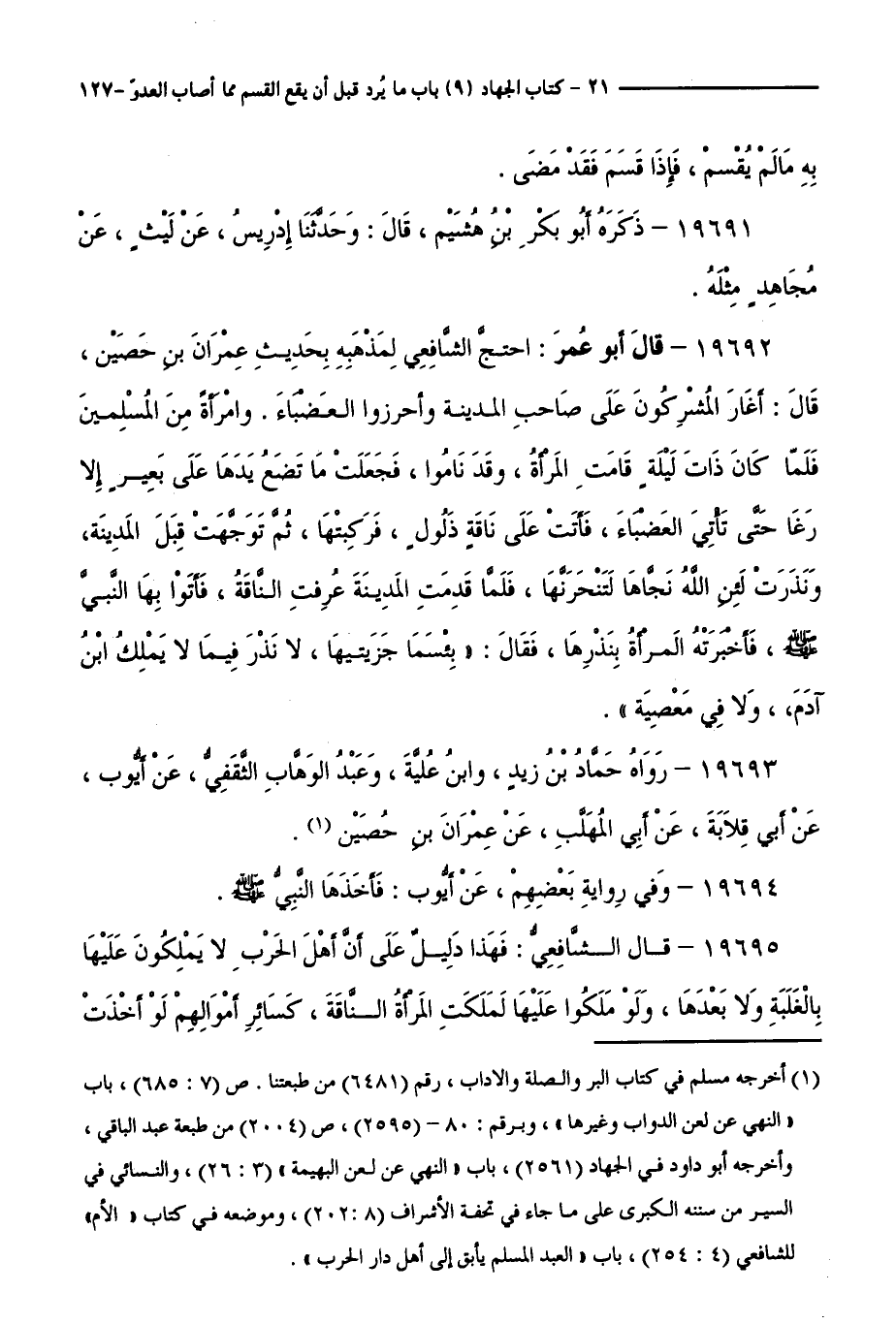19692 - قَالَ أَبُو عُمَرَ: احْتَجَّ الشَّافِعِيُّ لِمَذْهَبِهِ بِحَدِيثِ عِمْرَانَ بْنِ حُصَيْنٍ قَالَ: أَغَارَ الْمُشْرِكُونَ عَلَى صَاحِبِ الْمَدِينَةِ وَأَحْرَزُوا الْعَضْبَاءَ، وَامْرَأَةً مِنَ الْمُسْلِمِينَ فَلَمَّا كَانَ ذَاتَ لَيْلَةٍ قَامَتِ الْمَرْأَةُ، وَقَدْ نَامُوا، فَجَعَلَتْ مَا تَضَعُ يَدَهَا عَلَى بَعِيرٍ إِلَّا رَغَا حَتَّى تَأْتِيَ الْعَضْبَاءَ، فَأَتَتْ عَلَى نَاقَةٍ ذَلُولٍ، فَرَكِبَتْهَا، ثُمَّ تَوَجَّهَتْ قِبَلَ الْمَدِينَةِ وَنَذَرَتْ لَئِنِ اللَّهُ نَجَّاهَا لَتَنْحَرَنَّهَا، فَلَمَّا قَدِمَتِ الْمَدِينَةَ عُرِفَتِ النَّاقَةُ، فَأَتَوْا بِهَا النَّبِيَّ - صَلَّى اللَّهُ عَلَيْهِ وَسَلَّمَ - فَأَخْبَرَتْهُ الْمَرْأَةُ بِنَذْرِهَا، فَقَالَ بِئْسَمَا جَزَيْتِيهَا، لَا نَذْرَ فِيمَا لَا يَمْلِكُ ابْنُ آدَمَ وَلَا فِي مَعْصِيَةٍ.