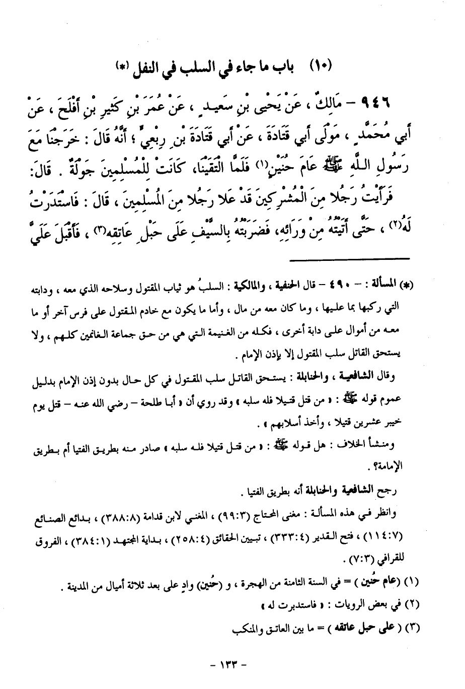 946 - مَالِكٌ، عَنْ يَحْيَى بْنِ سَعِيدٍ، عَنْ عُمَرَ بْنِ كَثِيرِ بْنِ أَفْلَحَ، عَنْ أَبِي مُحَمَّدٍ، مَوْلَى أَبِي قَتَادَةَ، عَنْ أَبِي قَتَادَةَ بْنِ رِبْعِيٍّ ؛ أَنَّهُ قَالَ: خَرَجْنَا مَعَ رَسُولِ اللَّهِ - صَلَّى اللَّهُ عَلَيْهِ وَسَلَّمَ - عَامَ حُنَيْنٍ، فَلَمَّا الْتَقَيْنَا كَانَتْ لِلْمُسْلِمِينَ جَوْلَةٌ: قَالَ: فَرَأَيْتُ رَجُلًا مِنَ الْمُشْرِكِينَ قَدْ عَلَا رَجُلًا مِنَ الْمُسْلِمِينَ، قَالَ: فَاسْتَدَرْتُ لَهُ حَتَّى أَتَيْتُهُ مِنْ وَرَائِهِ فَضَرَبْتُهُ بِالسَّيْفِ عَلَى حَبْلِ عَاتِقِهِ، فَأَقْبَلَ عَلَيَّ