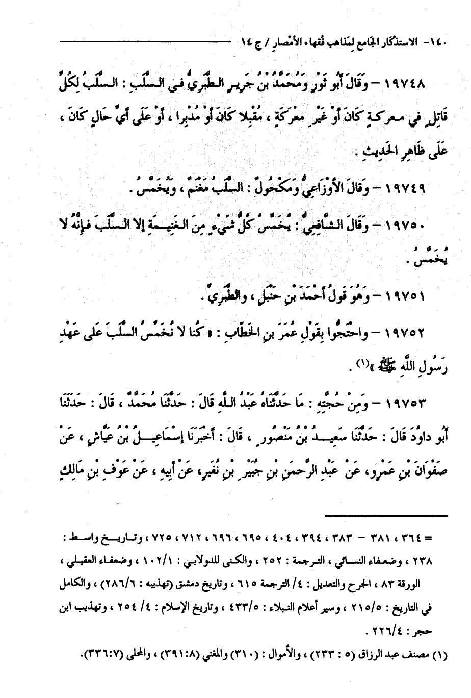 19749 - وَقَالَ الْأَوْزَاعِيُّ وَمَكْحُولٌ: السَّلَبُ مَغْنَمٌ، وَيُخَمَّسُ.