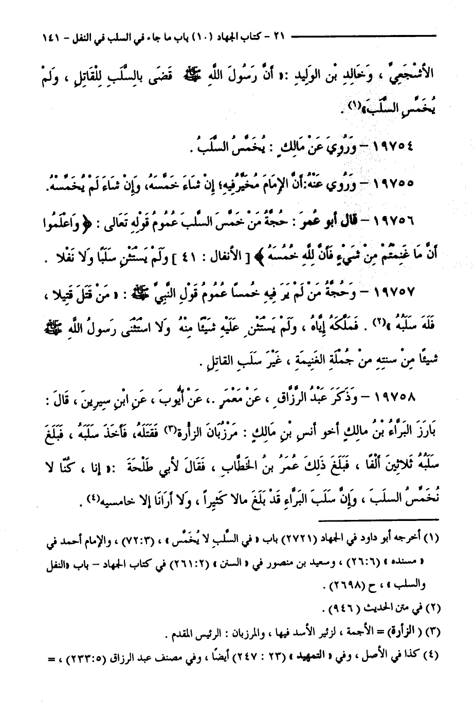 19758 - وَذَكَرَ عَبْدُ الرَّزَّاقِ، عَنْ مَعْمَرٍ. عَنْ أَيُّوبَ، عَنِ ابْنِ سِيرِينَ، قَالَ: بَارَزَ الْبَرَاءُ بْنُ مَالِكٍ أَخُو أَنَسِ بْنِ مَالِكٍ، مَرْزُبَانَ الزَّأْرَةِ فَقَتَلَهُ، فَأَخَذَ سَلَبَهُ، فَبَلَغَ سَلَبُهُ ثَلَاثِينَ أَلْفًا. فَبَلَغَ ذَلِكَ عُمَرَ بْنَ الْخَطَّابِ، فَقَالَ لِأَبِي طَلْحَةَ " إِنَّا، كُنَّا لَا نُخَمِّسُ السَّلَبَ، وَإِنَّ سَلَبَ الْبَرَاءِ قَدْ بَلَغَ مَالًا كَثِيرًا، وَلَا أَرَانَا إِلَّا خَامِسِيهِ.