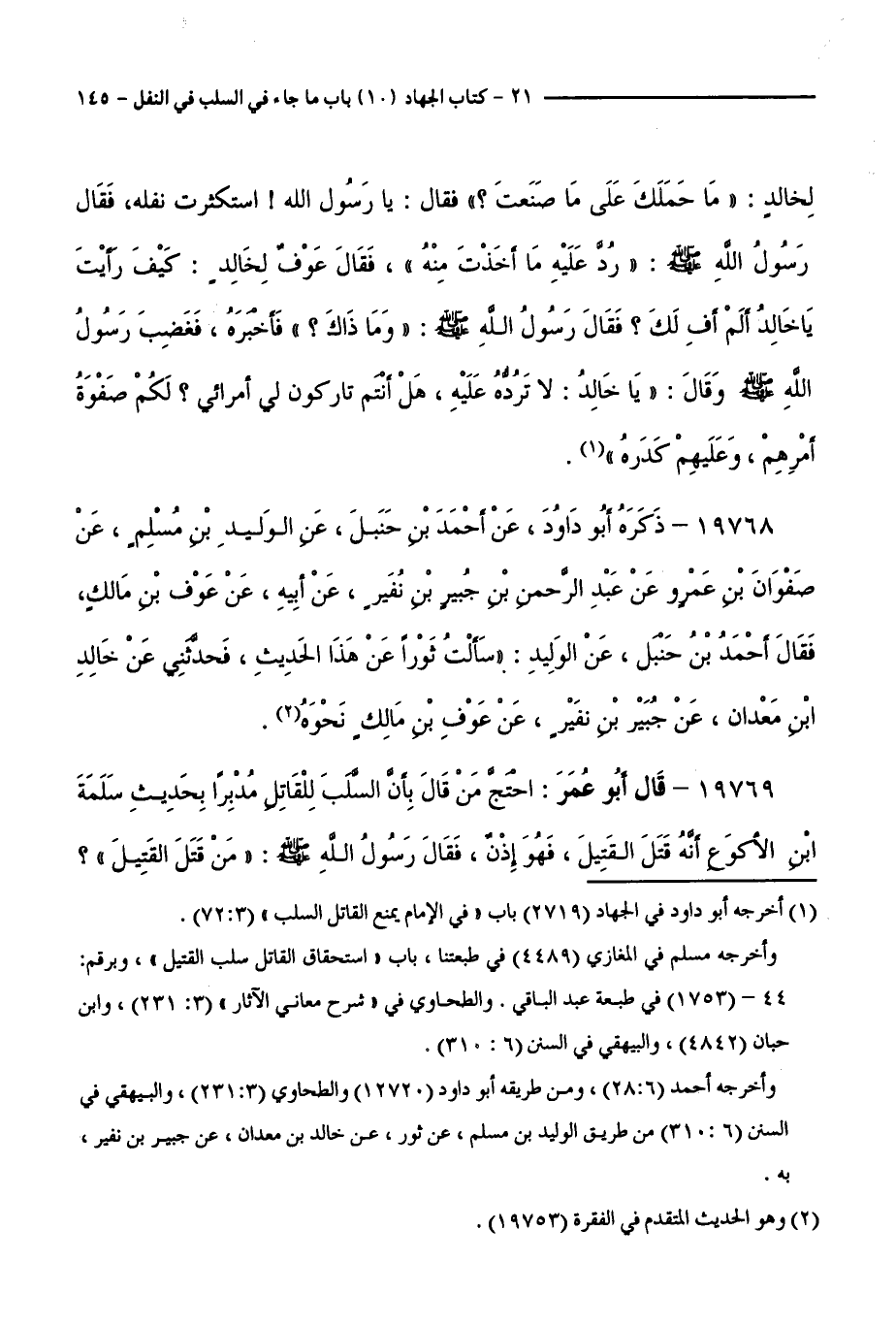 لِخَالِدٍ: " مَا حَمَلَكَ عَلَى مَا صَنَعْتَ ؟ " فَقَالَ يَا رَسُولَ اللَّهِ ! اسْتَكْثَرْتُ نَفْلَهُ، فَقَالَ رَسُولُ اللَّهِ - صَلَّى اللَّهُ عَلَيْهِ وَسَلَّمَ - " رُدَّ عَلَيْهِ مَا أَخَذْتَ مِنْهُ "، فَقَالَ عَوْفٌ لِخَالِدٍ: كَيْفَ رَأَيْتَ يَا خَالِدُ أَلَمْ أَفِ لَكَ ؟ فَقَالَ رَسُولُ اللَّهِ - صَلَّى اللَّهُ عَلَيْهِ وَسَلَّمَ - " وَمَا ذَاكَ ؟ " فَأَخْبَرَهُ، فَغَضِبَ رَسُولُ اللَّهِ - صَلَّى اللَّهُ عَلَيْهِ وَسَلَّمَ - وَقَالَ: " يَا خَالِدُ: لَا تَرُدُّهُ عَلَيْهِ، هَلْ أَنْتُمْ، تَارِكُونَ لِي أُمَرَائِي ؟ لَكُمْ صَفْوَةُ أَمْرِهِمْ، وَعَلَيْهِمْ كَدَرُهُ ".