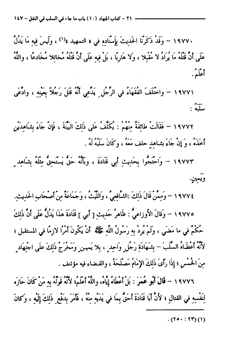 19775 - وَقَالَ الْأَوْزَاعِيُّ: ظَاهِرُ حَدِيثِ [ أَبِي ] قَتَادَةَ هَذَا يَدُلُّ عَلَى أَنَّ ذَلِكَ حُكْمٌ فِيمَا مَضَى، وَلَمْ يُرِدْ بِهِ رَسُولُ اللَّهِ - صَلَّى اللَّهُ عَلَيْهِ وَسَلَّمَ - أَنْ يَكُونَ أَمْرًا لَازِمًا فِي الْمُسْتَقْبَلِ ؛ لِأَنَّهُ أَعْطَاهُ السَّلَبَ - بِشَهَادَةِ رَجُلٍ وَاحِدٍ، بِلَا يَمِينٍ وَمَخْرَجُ ذَلِكَ عَلَى اجْتِهَادٍ مِنَ الْخُمُسِ ؛ إِذَا رَأَى ذَلِكَ الْإِمَامُ مَصْلَحَةً، وَالْقَضَاءُ فِيهِ مُؤْتَنِفٌ.