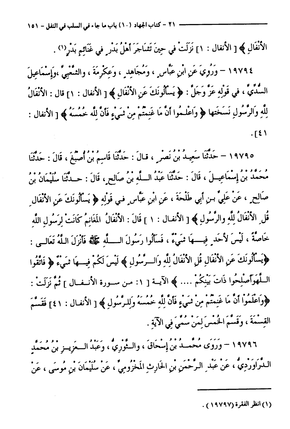 19795 - حَدَّثَنَا سَعِيدُ بْنُ نَصْرٍ، قَالَ: حَدَّثَنَا قَاسِمُ بْنُ أَصْبَغَ، قَالَ: حَدَّثَنَا مُحَمَّدُ بْنُ إِسْمَاعِيلَ، قَالَ: حَدَّثَنَا عَبْدُ اللَّهِ بْنُ صَالِحٍ، قَالَ: حَدَّثَنَا سُلَيْمَانُ بْنُ صَالِحٍ، عَنْ عَلِيِّ بْنِ أَبِي طَلْحَةَ، عَنِ ابْنِ عَبَّاسٍ فِي قَوْلِهِ:يَسْأَلُونَكَ عَنِ الْأَنْفَالِ قُلِ الْأَنْفَالُ لِلَّهِ وَالرَّسُولِ [ الْأَنْفَالِ: 1 ] قَالَ: الْأَنْفَالُ الْمَغَانِمُ كَانَتْ لِرَسُولِ اللَّهِ خَاصَّةً، لَيْسَ لِأَحَدٍ فِيهَا شَيْءٌ، فَسَأَلُوا رَسُولَ اللَّهِ - صَلَّى اللَّهُ عَلَيْهِ وَسَلَّمَ - فَأَنْزَلَ اللَّهُ تَعَالَى:يَسْأَلُونَكَ عَنِ الْأَنْفَالِ قُلِ الْأَنْفَالُ لِلَّهِ وَالرَّسُولِ لَيْسَ لَكُمْ فِيهَا شَيْءٌفَاتَّقُوا اللَّهَ وَأَصْلِحُوا ذَاتَ بَيْنِكُمْ.. الْآيَةَ [ 1: مِنْ سُورَةِ الْأَنْفَالِ ] ثُمَّ نَزَلَتْ:وَاعْلَمُوا أَنَّ مَا غَنِمْتُمْ مِنْ شَيْءٍ فَأَنَّ لِلَّهِ خُمُسَهُ وَلِلرَّسُولِ [ الْأَنْفَالِ: 41 ] فَقَسَّمَ الْقِسْمَةِ، وَقَسَّمَ الْخُمُسَ لِمَنْ سُمِّيَ فِي الْآيَةِ.