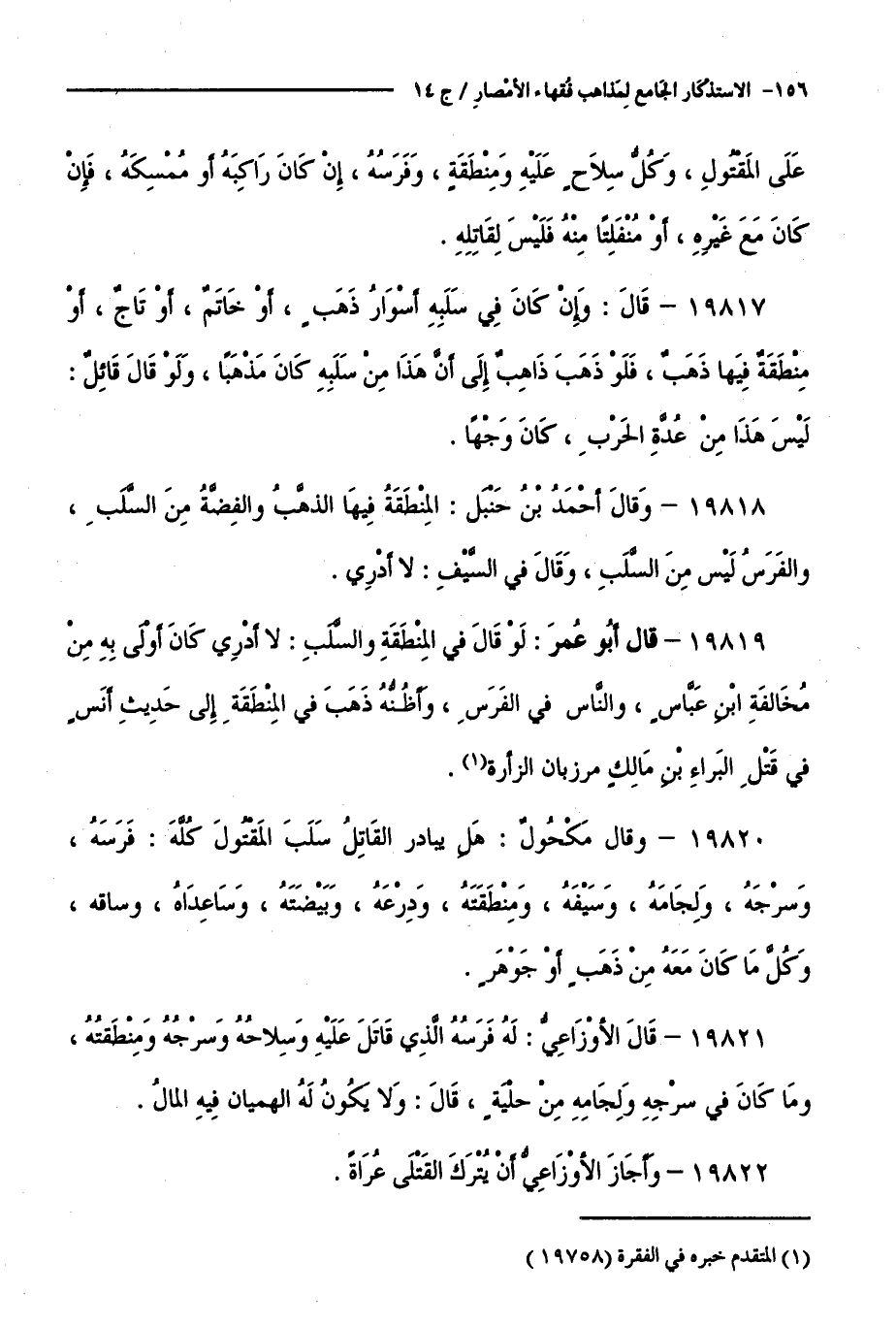 19820 - وَقَالَ مَكْحُولٌ هَلْ يُبَادِرُ الْقَاتِلُ سَلَبَ الْمَقْتُولَ كُلَّهَ: فَرَسَهُ، وَسَرْجَهُ، وَلِجَامَهُ، وَسَيْفَهُ، وَمِنْطَقَتَهُ، وَدِرْعَهُ، وَبَيْضَتَهُ، وَسَاعِدَيْهِ، وَسَاقَهُ، وَكُلَّ مَا كَانَ مَعَهُ مِنْ ذَهَبٍ أَوْ جَوْهَرٍ.
