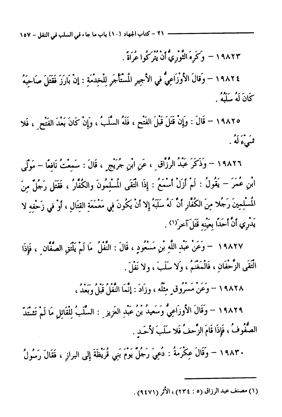 19827 - وَعَنْ عَبْدِ اللَّهِ بْنِ مَسْعُودٍ، قَالَ: النَّفْلُ مَا لَمْ يَلْتَقِ الصَّفَّانِ، فَإِذَا الْتَقَى الزَّحَفَانِ، فَالْمَغْنَمُ، وَلَا سَلَبَ، وَلَا نَفْلَ.