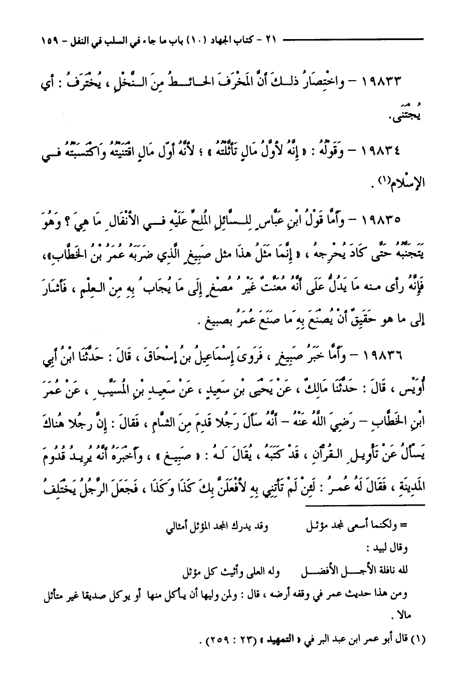 19835 - وَأَمَّا قَوْلُ ابْنِ عَبَّاسٍ لِلسَّائِلِ الْمُلِحِّ عَلَيْهِ فِي الْأَنْفَالِ مَا هِيَ ؟ وَهُوَ يَتَجَنَّبُهُ حَتَّى كَادَ يُحْرِجَهُ، " إِنَّمَا مَثَلُ هَذَا مَثَلُ صَبِيغٍ الَّذِي ضَرَبَهُ عُمَرُ بْنُ الْخَطَّابِ "، فَإِنَّهُ رَأَى مِنْهُ مَا يَدُلُّ عَلَى أَنَّهُ مُعَنَّتٌ غَيْرُ مُصْغٍ إِلَى مَا يَجِبُ بِهِ مِنَ الْعِلْمِ، فَأَشَارَ إِلَى مَا هُوَ حَقِيقٌ بِهِ مَا صَنَعَ عُمَرُ بِصَبِيغٍ.