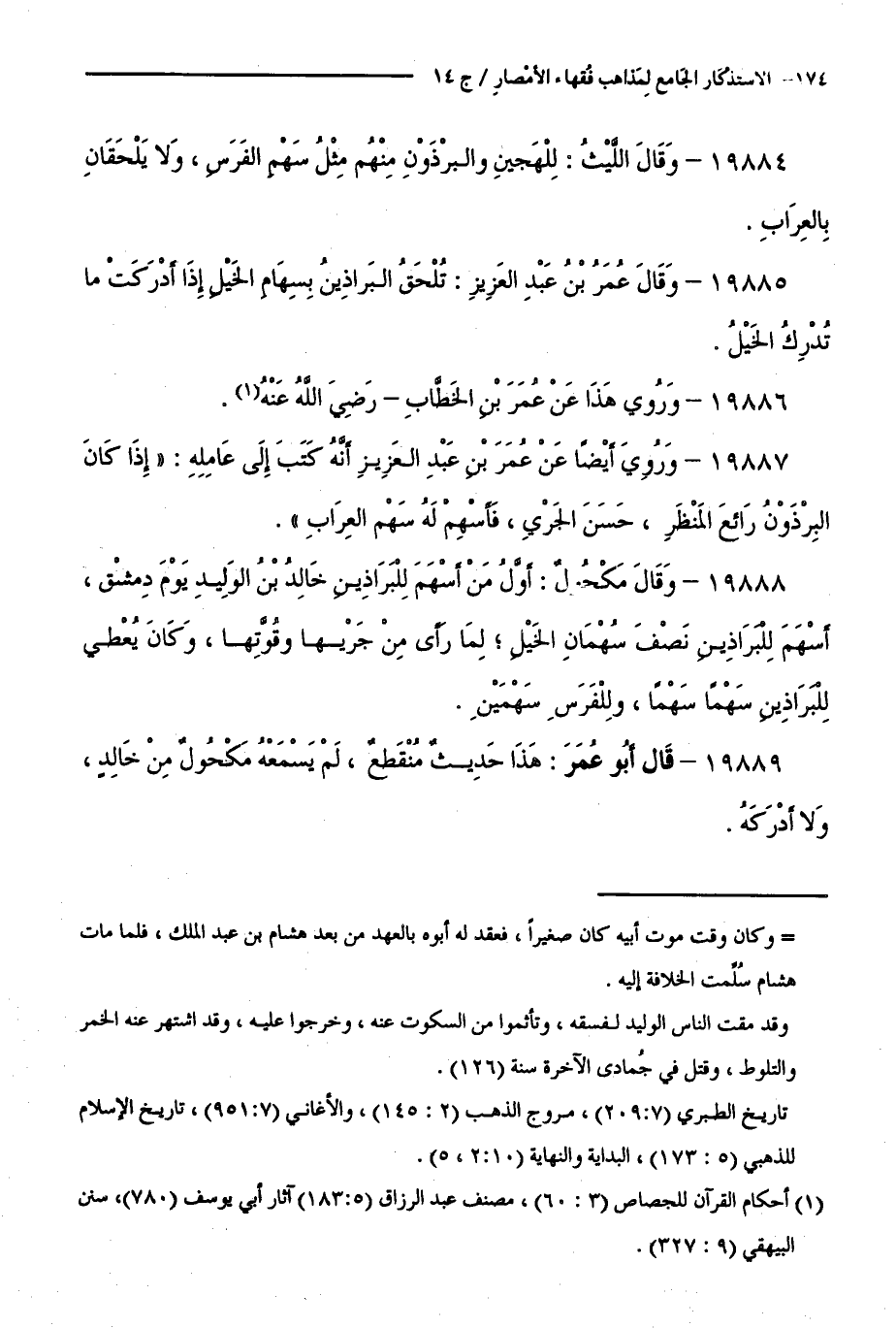 19888 - وَقَالَ مَكْحُولٌ: أَوَّلُ مَنْ أَسْهَمَ لِلْبَرَاذِينِ خَالِدُ بْنُ الْوَلِيدِ يَوْمَ دِمَشْقَ، أَسْهَمَ لِلْبَرَاذِينِ نَصْفَ سُهْمَانِ الْخَيْلِ ؛ لِمَا رَأَى مِنْ جَرْيِهَا وَقُوَّتِهَا، وَكَانَ يُعْطِي لِلْبَرَاذِينِ سَهْمًا سَهْمًا، وَلِلْفَرَسِ سَهْمَيْنِ.