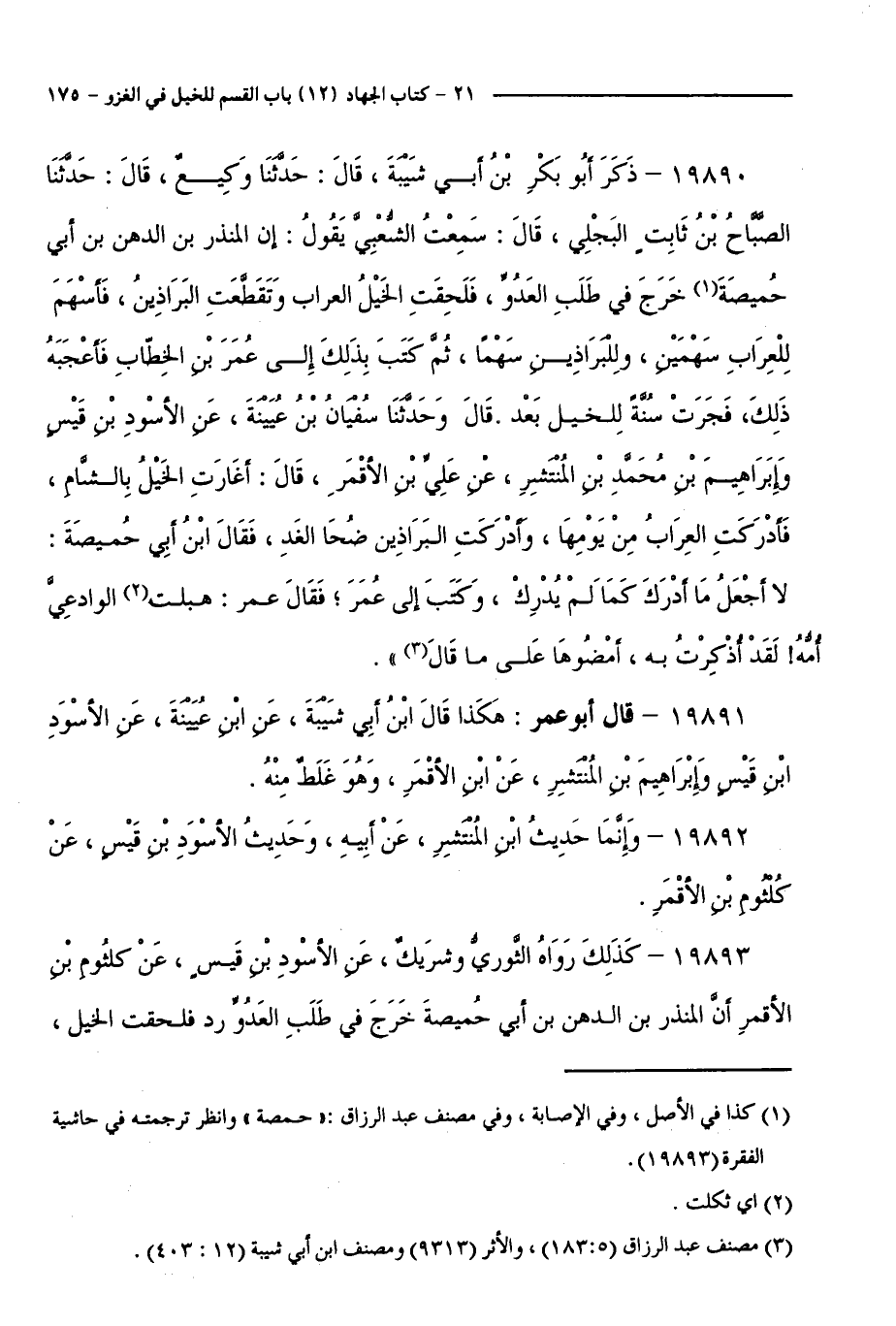 19890 - ذَكَرَ أَبُو بَكْرِ بْنُ أَبِي شَيْبَةَ، قَالَ: حَدَّثَنَا وَكِيعٌ، قَالَ: حَدَّثَنَا الصَّبَاحُ بْنُ ثَابِتٍ الْبَجَلِيُّ، قَالَ: سَمِعْتُ الشَّعْبِيَّ يَقُولُ: إِنَّ الْمُنْذِرَ بْنَ الدُّهْنِ بْنِ أَبِي حُمَيْصَةَ خَرَجَ فِي طَلَبِ الْعَدُوِّ، فَلَحِقَتِ الْخَيْلُ الْعِرَابُ وَتَقَطَّعَتِ الْبَرَاذِينُ، فَأَسْهَمَ لِلْعِرَابِ سَهْمَيْنِ، وَلِلْبَرَاذِينِ سَهْمًا، ثُمَّ كَتَبَ بِذَلِكَ إِلَى عُمَرَ بْنِ الْخَطَّابِ فَأَعْجَبَهُ ذَلِكَ، فَجَرَتْ سُنَّةً لِلْخَيْلِ بَعْدُ. قَالَ: وَحَدَّثَنَا سُفْيَانُ بْنُ عُيَيْنَةَ، عَنِ الْأَسْوَدِ بْنِ قَيْسٍ وَإِبَرَاهِيمَ بْنِ مُحَمَّدِ بْنِ الْمُنْتَشِرِ، عَنْ عَلِيِّ بْنِ الْأَقْمَرِ، قَالَ: أَغَارَتِ الْخَيْلُ بِالشَّامِ، فَأَدْرَكَتِ الْعِرَابُ مِنْ يَوْمِهَا، وَأَدْرَكَتِ الْبَرَاذِينُ ضُحَا الْغَدِ، فَقَالَ ابْنُ أَبِي حُمَيْصَةَ: لَا أَجْعَلُ مَا أَدْرَكَ كَمَا لَمْ يُدْرِكْ، وَكَتَبَ إِلَى عُمَرَ ؟ فَقَالَ عُمَرُ: " هَبِلَتِ الْوَادِعِيَّ أُمُّهُ ! لَقَدْ أُذْكِرْتُ بِهِ، أَمْضُوهَا عَلَى مَا قَالَ ".