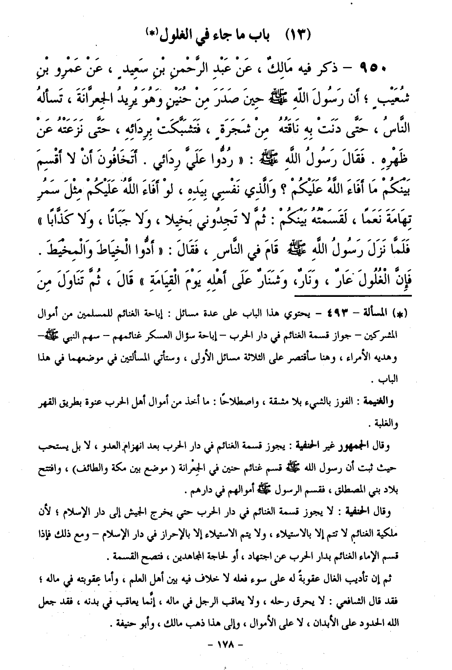 950 - ذَكَرَ فِيهِ مَالِكٌ، عَنْ عَبْدِ الرَّحْمَنِ بْنِ سَعِيدٍ، عَنْ عَمْرِو بْنِ شُعَيْبٍ، أَنَّ رَسُولَ اللَّهِ - صَلَّى اللَّهُ عَلَيْهِ وَسَلَّمَ - حِينَ صَدَرَ مِنْ حُنَيْنٍ وَهُوَ يُرِيدُ الْجِعِرَّانَةَ سَأَلَهُ اَلنَّاسُ حَتَّى دَنَتْ بِهِ نَاقَتُهُ مِنْ شَجَرَةٍ، فَتَشَبَّكَتْ بِرِدَائِهِ، حَتَّى نَزْعَتْهُ عَنْ ظَهْرِهِ، فَقَالَ رَسُولُ اللَّهِ - صَلَّى اللَّهُ عَلَيْهِ وَسَلَّمَ -: " رُدُّوا عَلَيَّ رِدَائِي أَتَخَافُونَ أَلَّا أَقْسِمَ بَيْنَكُمْ مَا أَفَاءَ اللَّهُ عَلَيْكُمْ ؟ وَالَّذِي نَفْسِي بِيَدِهِ، لَوْ أَفَاءَ اللَّهُ عَلَيْكُمْ مِثْلَ سَمُرِ تِهَامَةَ نَعَمًا، لَقَسَمْتُهُ بَيْنَكُمْ: ثُمَّ لَا تَجِدُونِي بَخِيلًا، وَلَا جَبَانًا، وَلَا كَذَّابًا " فَلَمَّا نَزَلَ رَسُولُ اللَّهِ - صَلَّى اللَّهُ عَلَيْهِ وَسَلَّمَ - قَامَ فِي النَّاسِ، فَقَالَ: " أَدُّوا الْخِيَاطَ وَالْمِخْيَطَ. فَإِنَّ الْغُلُولَ عَارٌ، وَنَارٌ، وَشَنَارٌ عَلَى أَهْلِهِ يَوْمَ الْقِيَامَةِ " قَالَ، ثُمَّ تَنَاوَلَ مِنَ