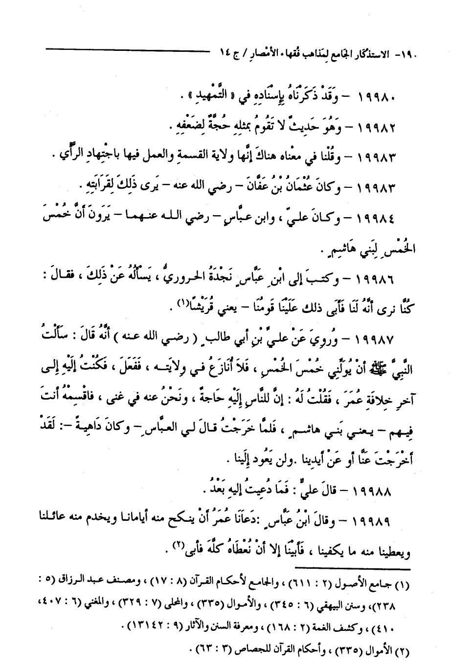19985 - وَكَانَ عَلِيٌّ، وَابْنُ عَبَّاسٍ - رَضِيَ اللَّهُ عَنْهُمَا - يَرَوْنَ أَنَّ خُمُسَ الْخُمُسِ لِبَنِي هَاشِمٍ.