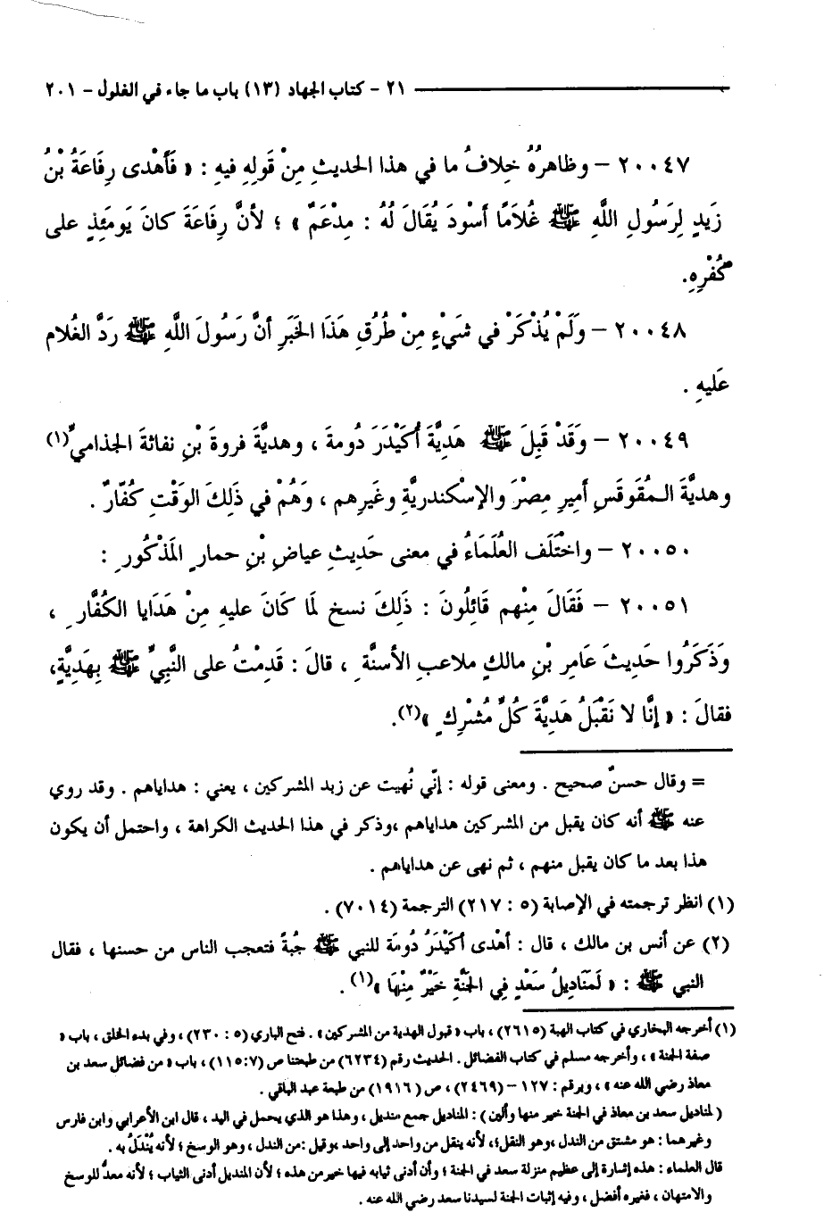 20047 - وَظَاهِرُهُ خِلَافُ مَا فِي هَذَا الْحَدِيثِ مِنْ قَوْلِهِ فِيهِ: " فَأَهْدَى رَفَاعَةُ بْنُ زَيْدٍ لِرَسُولِ اللَّهِ - صَلَّى اللَّهُ عَلَيْهِ وَسَلَّمَ - غُلَامًا أَسْوَدَ يُقَالَ أَنَّهُ: مِدْعَمٌ " ؛ لِأَنَّ رِفَاعَةَ كَانَ يَوْمَئِذٍ عَلَى كُفْرِهِ.