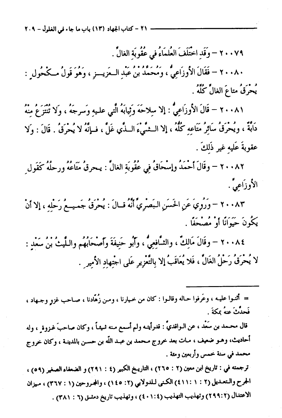 20084 - وَقَالَ مَالِكٌ، وَالشَّافِعِيُّ، وَأَبُو حَنِيفَةَ وَأَصْحَابُهُمْ وَاللَّيْثُ بْنُ سَعْدٍ: لَا يُحْرَقُ رَحْلُ الْغَالِّ، فَلَا يُعَاقَبُ إِلَّا بِالتَّعْزِيرِ عَلَى اجْتِهَادِ الْأَمِيرِ.