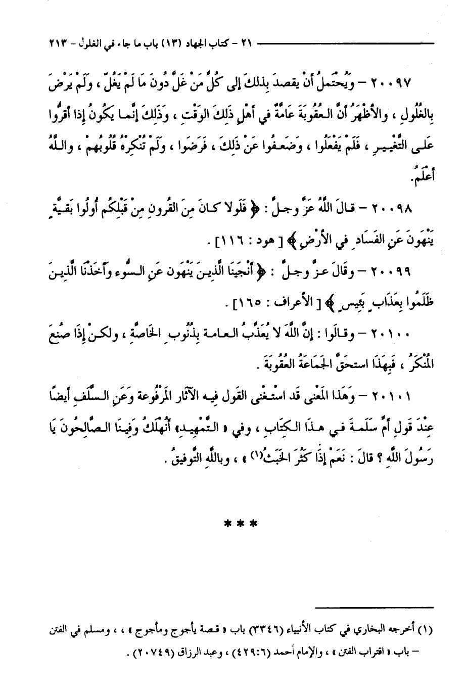 20100 - وَقَالُوا: إِنَّ اللَّهَ لَا يُعَذِّبُ الْعَامَّةَ بِذُنُوبِ الْخَاصَّةِ، وَلَكِنْ إِذَا صُنِعَ الْمُنْكَرُ، فَبِهَذَا اسْتَحَقَّ الْجَمَاعَةُ الْعُقُوبَةَ.