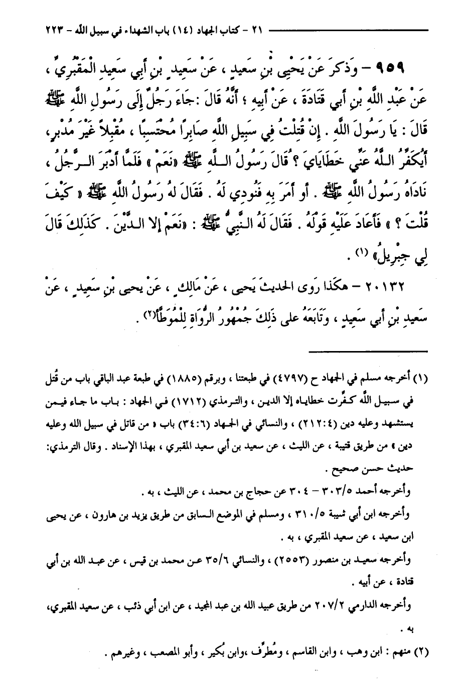 959 - وَذُكِرَ عَنْ يَحْيَى بْنِ سَعِيدٍ، عَنْ سَعِيدِ بْنِ أَبِي سَعِيدٍ الْمَقْبُرِيِّ، عَنْ عَبْدِ اللَّهِ بْنِ أَبِي قَتَادَةَ، عَنْ أَبِيهِ ؛ أَنَّهُ قَالَ: جَاءَ رَجُلٌ إِلَى رَسُولِ اللَّهِ - صَلَّى اللَّهُ عَلَيْهِ وَسَلَّمَ - قَالَ: يَا رَسُولَ اللَّهِ. إِنْ قُتِلْتُ فِي سَبِيلِ اللَّهِ صَابِرًا مُحْتَسِبًا، مُقْبِلًا غَيْرَ مُدْبِرٍ، أَيُكَفِّرُ اللَّهُ عَنِّي خَطَايَايَ ؛ قَالَ رَسُولُ اللَّهِ - صَلَّى اللَّهُ عَلَيْهِ وَسَلَّمَ - " نَعَمْ "، فَلَمَّا أَدْبَرَ الرَّجُلُ، نَادَاهُ رَسُولُ اللَّهِ - صَلَّى اللَّهُ عَلَيْهِ وَسَلَّمَ -. أَوْ أَمَرَ بِهِ فَنُودِيَ لَهُ. فَقَالَ لَهُ رَسُولُ اللَّهِ - صَلَّى اللَّهُ عَلَيْهِ وَسَلَّمَ -: " كَيْفَ قُلْتَ ؟ "، فَأَعَادَ عَلَيْهِ قَوْلَهُ، فَقَالَ لَهُ النَّبِيُّ - صَلَّى اللَّهُ عَلَيْهِ وَسَلَّمَ -: " نَعَمْ إِلَّا الدَّيْنَ كَذَلِكَ قَالَ لِي جِبْرِيلُ ".