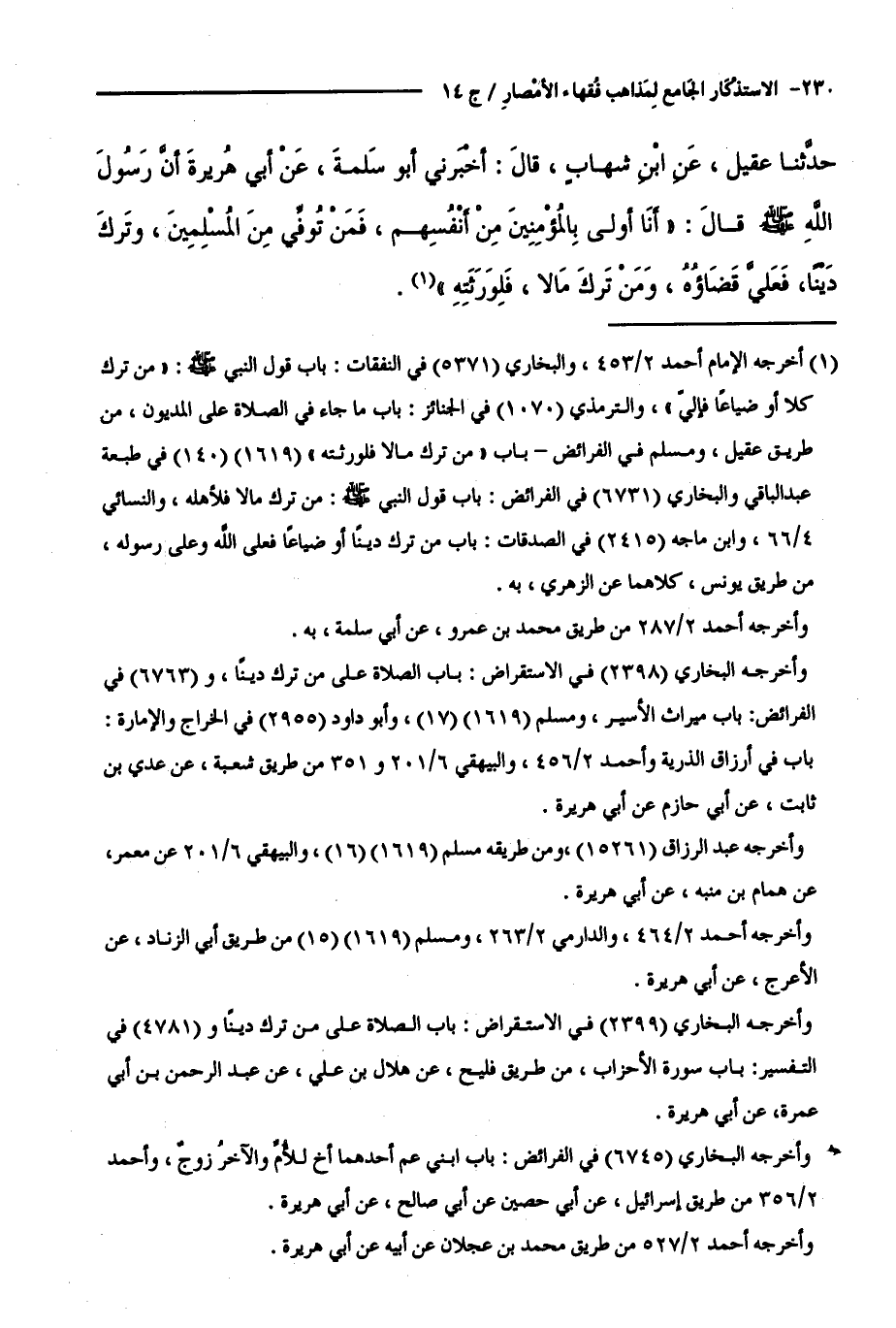 حَدَّثَنَا عُقَيْلٌ، عَنِ ابْنِ شِهَابٍ، قَالَ: أَخْبَرَنِي أَبُو سَلَمَةَ، عَنْ أَبِي هُرَيْرَةَ أَنَّ رَسُولَ اللَّهِ - صَلَّى اللَّهُ عَلَيْهِ وَسَلَّمَ - قَالَ: أَنَا أَوْلَى بِالْمُؤْمِنِينَ مِنْ أَنْفُسِهِمْ، فَمَنْ تُوُفِّيَ مِنَ الْمُسْلِمِينَ، وَتَرَكَ دَيْنًا، فَعَلَيَّ قَضَاؤُهُ، وَمَنْ تَرَكَ مَالًا، فَلِوَرَثَتِهِ.