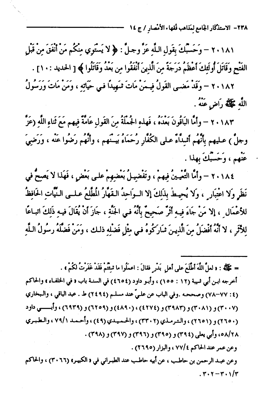20181 - وَحَسْبُكَ بِقَوْلِ اللَّهِ - عَزَّ وَجَلَّ -:لَا يَسْتَوِي مِنْكُمْ مَنْ أَنْفَقَ مِنْ قَبْلِ الْفَتْحِ وَقَاتَلَ أُولَئِكَ أَعْظَمُ دَرَجَةً مِنَ الَّذِينَ أَنْفَقُوا مِنْ بَعْدُ وَقَاتَلُوا [ الْحَدِيدِ: 10 ].