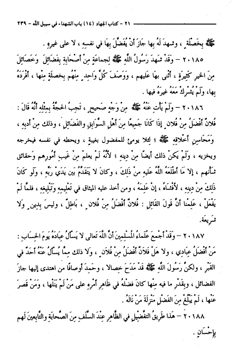 20186 - وَلَمْ يَأْتِ عَنْهُ - صَلَّى اللَّهُ عَلَيْهِ وَسَلَّمَ - مِنْ وَجْهٍ صَحِيحٍ، تَجِبُ الْحُجَّةُ بِمِثْلِهِ أَنَّهُ قَالَ: فَلَانٌ أَفْضَلُ مِنْ فُلَانٍ إِذَا كَانَا جَمِيعًا مِنْ أَهْلِ السَّوَابِقِ وَالْفَضَائِلِ، وَذَلِكَ مِنْ أَدَبِهِ، وَمَحَاسِنِ أَخْلَاقِهِ - صَلَّى اللَّهُ عَلَيْهِ وَسَلَّمَ - ؛ لِئَلَّا يُومِئَ لِلْمَفْضُولِ بِغِيبَةٍ، وَيَحُطُّهُ فِي نَفْسِهِ فَيُحْرِجُهُ وَيُخْزِيهِ، وَلَمْ يَكُنْ ذَلِكَ أَيْضًا مِنْ دِينِهِ ؛ لِأَنَّهُ لَمْ يَعْلَمْ مِنْ غَيْبِ أُمُورِهِمْ وَحَقَائِقِ شَأْنِهِمْ، إِلَّا مَا أَطْلَعَهُ اللَّهُ عَلَيْهِ مِنْ ذَلِكَ، وَكَانَ لَا يُقَدِّمُ بَيْنَ يَدَيْ رَبِّهِ، وَلَوْ كَانَ ذَلِكَ مِنْ دِينِهِ، لَأَفْشَاهُ، إِنْ عَلِمَهُ، وَمَنْ أَخَذَ عَلَيْهِ الْمِيثَاقَ فِي تَعْلِيمِهِ وَتَبْلِيغِهِ، فَلَمَّا لَمْ يَفْعَلْ، عَلِمْنَا أَنَّ قَوْلَ الْقَائِلِ: فَلَانٌ أَفْضَلُ مِنْ فُلَانٍ، بَاطِلٌ، وَلَيْسَ بِدِينٍ وَلَا شَرِيعَةٍ.