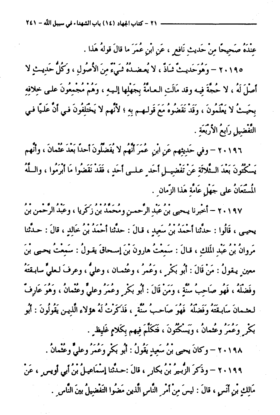 20199 - وَذَكَرَ الزُّبَيْرُ بْنُ بَكَّارٍ قَالَ: حَدَّثَنَا إِسْمَاعِيلُ بْنُ أَبِي أُوَيْسٍ، عَنْ مَالِكِ بْنِ أَنَسٍ، قَالَ: لَيْسَ مِنْ أَمْرِ النَّاسِ الَّذِينَ مَضَوُا التَّفْضِيلُ بَيْنَ النَّاسِ.