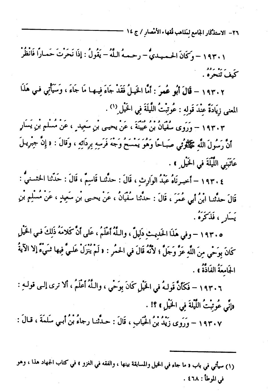 19302 - قَالَ أَبُو عُمَرَ: أَمَّا الْخَيْلُ فَقَدْ جَاءَ فِيهَا مَا جَاءَ، وَسَيَأْتِي فِي هَذَا الْمَعْنَى زِيَادَةٌ عِنْدَ قَوْلِهِ: عُوتِبْتُ اللَّيْلَةَ فِي الْخَيْلِ.