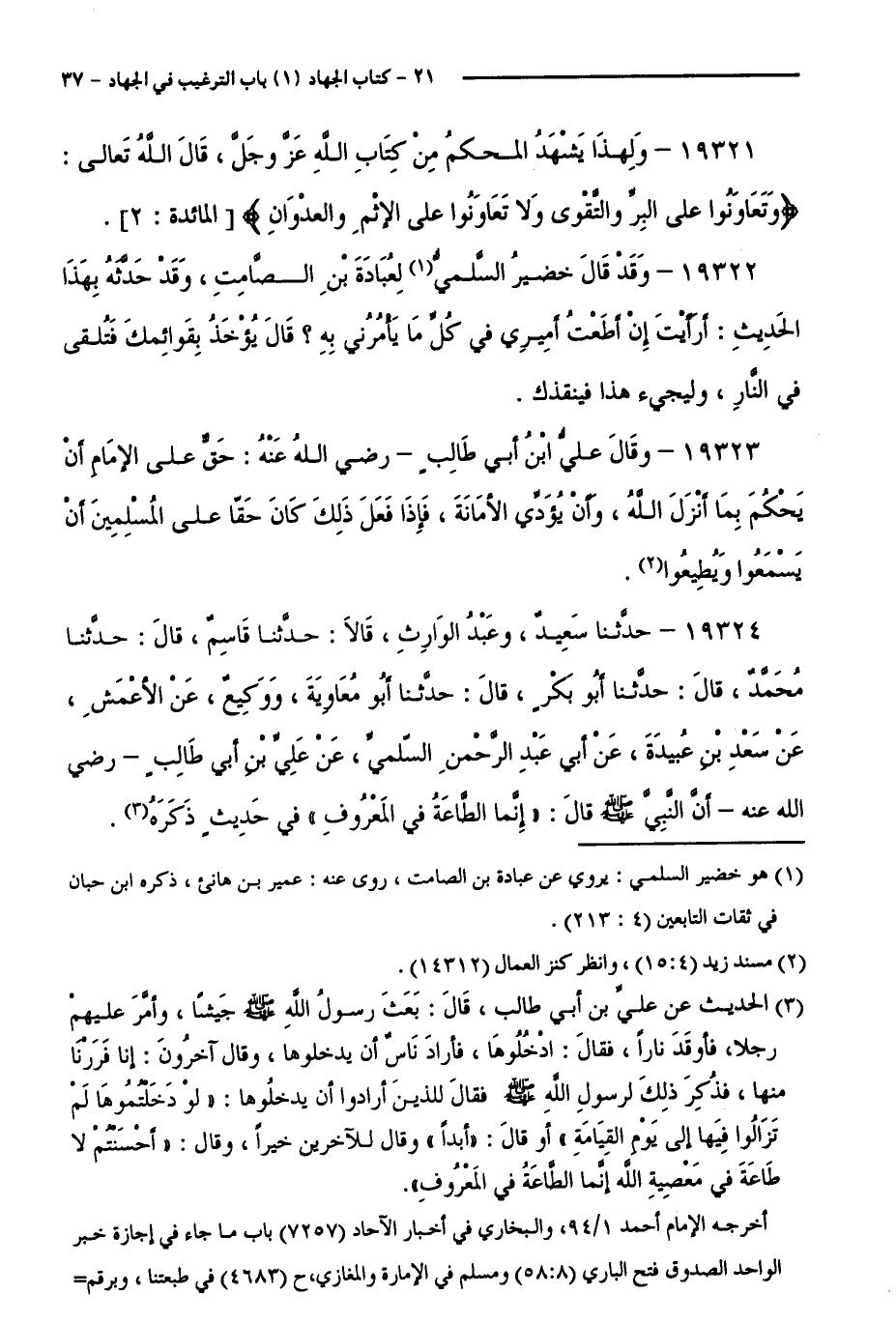 19224 - حَدَّثَنَا سَعِيدٌ، وَعَبْدُ الْوَارِثِ، قَالَا: حَدَّثَنَا قَاسِمٌ، قَالَ: حَدَّثَنَا مُحَمَّدٌ، قَالَ: حَدَّثَنَا أَبُو بَكْرٍ، قَالَ: حَدَّثَنَا أَبُو بَكْرٍ، قَالَ: حَدَّثَنَا أَبُو مُعَاوِيَةَ، وَوَكِيعٌ، عَنِ الْأَعْمَشِ، عَنْ سَعِيدِ بْنِ عُبَيْدَةَ، عَنْ أَبِي عَبْدِ الرَّحْمَنِ السُّلَمِيِّ، عَنْ عَلِيِّ بْنِ أَبِي طَالِبٍ - رَضِيَ اللَّهُ عَنْهُ - أَنَّ النَّبِيَّ - صَلَّى اللَّهُ عَلَيْهِ وَسَلَّمَ - قَالَ: " إِنَّمَا الطَّاعَةُ فِي الْمَعْرُوفِ " فِي حَدِيثٍ ذَكَرَهُ.