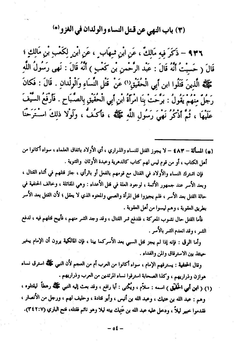 936 - ذَكَرَ فِيهِ مَالِكٌ: عَنِ ابْنِ شِهَابٍ، عَنِ ابْنٍ لِكَعْبِ بْنِ مَالِكٍ ؛ قَالَ " حَسِبْتُ أَنَّهُ قَالَ: عَبْدُ الرَّحْمَنِ بْنُ كَعْبٍ " أَنَّهُ قَالَ: نَهَى رَسُولُ اللَّهِ - صَلَّى اللَّهُ عَلَيْهِ وَسَلَّمَ - الَّذِينَ قَتَلُوا ابْنَ أَبِي الْحَقِيقِ، عَنْ قَتْلِ النِّسَاءِ وَالْوِلْدَانِ، قَالَ: فَكَانَ رَجُلٌ مِنْهُمْ يَقُولُ: بَرَّحَتْ بِنَا امْرَأَةُ ابْنِ أَبِي الْحَقِيقِ بِالصَّبَاحِ: فَأَرْفَعُ السَّيْفَ عَلَيْهَا، ثُمَّ أَذْكُرُ نَهْيَ رَسُولِ اللَّهِ - صَلَّى اللَّهُ عَلَيْهِ وَسَلَّمَ - فَأَكُفُّ، وَلَوْلَا ذَلِكَ اسْتَرَحْنَا