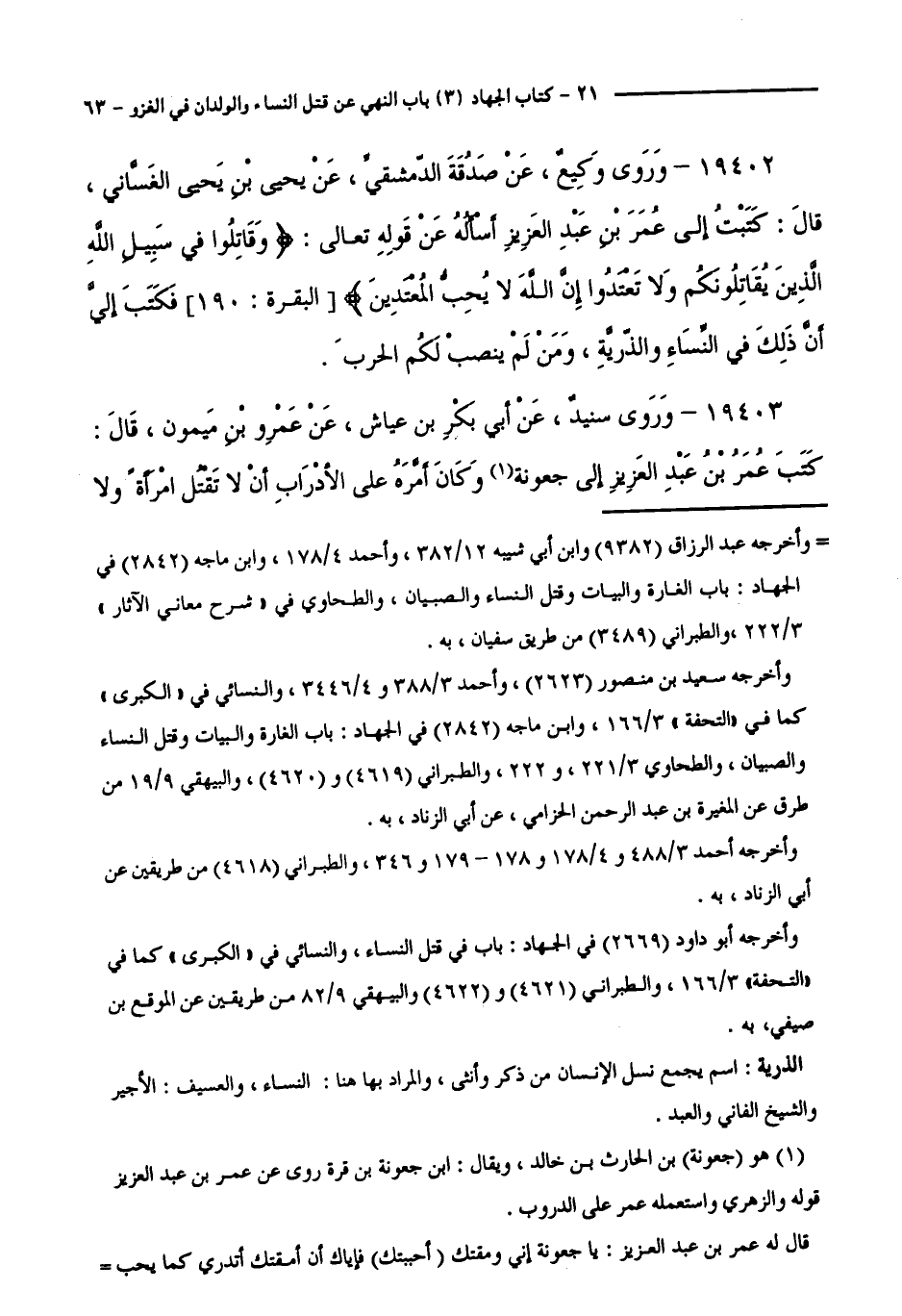 19403 - وَرَوَى سُنَيْدٌ، عَنْ أَبِي بَكْرِ بْنِ عَيَّاشٍ، عَنْ عَمْرِو بْنِ مَيْمُونٍ، قَالَ: كَتَبَ عُمَرُ بْنُ عَبْدِ الْعَزِيزِ إِلَى جَعْوَنَةَ وَكَانَ أَمَّرَهُ عَلَى الْأَدْرَابِ أَلَّا تَقْتُلَ امْرَأَةً وَلَا