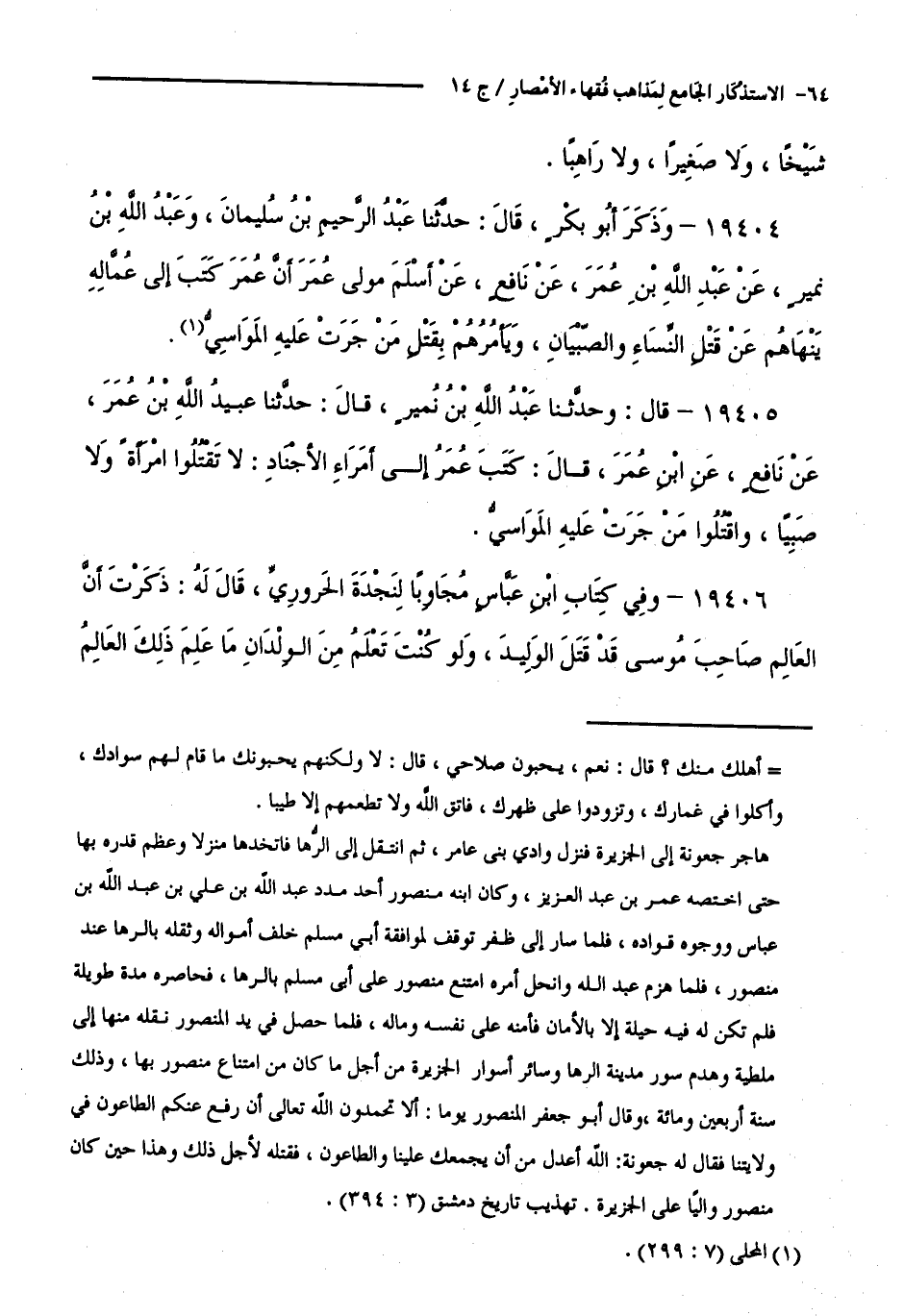 19405 - قَالَ: وَحَدَّثَنَا عَبْدُ اللَّهِ بْنُ نُمَيْرٍ، قَالَ: حَدَّثَنَا عُبَيْدُ اللَّهِ بْنُ عُمَرَ، عَنْ نَافِعٍ، عَنِ ابْنِ عُمَرَ، قَالَ: كَتَبَ عُمَرُ إِلَى أُمَرَاءِ الْأَجْنَادِ: لَا تَقْتُلُوا امْرَأَةً وَلَا صَبِيًّا، وَاقْتُلُوا مَنْ جَرَتْ عَلَيْهِ الْمَوَاسِيُّ.