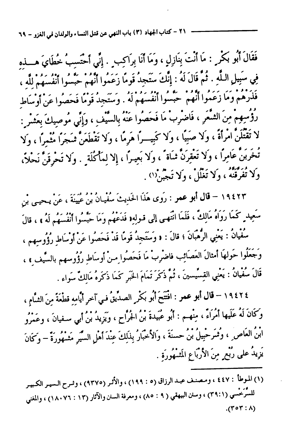 فَقَالَ أَبُو بَكْرٍ: مَا أَنْتَ بِنَازِلٍ، وَمَا أَنَا بِرَاكِبٍ. إِنِّي أَحْتَسِبُ خُطَايَ هَذِهِ فِي سَبِيلِ اللَّهِ. ثُمَّ قَالَ لَهُ: إِنَّكَ سَتَجِدُ قَوْمًا زَعَمُوا أَنَّهُمْ حَبَسُوا أَنْفُسَهُمْ لِلَّهِ، فَذَرْهُمْ وَمَا زَعَمُوا أَنَّهُمْ حَبَسُوا أَنْفُسَهُمْ لَهُ. وَسَتَجِدُ قَوْمًا فَحَصُوا عَنْ أَوْسَاطِ رُءُوسِهِمْ مِنَ الشَّعْرِ، فَاضْرِبْ مَا فَحَصُوا عَنْهُ بِالسَّيْفِ، وَإِنِّي مُوصِيكَ بِعَشْرٍ: لَا تَقْتُلَنَّ امْرَأَةً، وَلَا صَبِيًّا، وَلَا كَبِيرًا هَرِمًا، وَلَا تَقْطَعَنَّ شَجَرًا مُثْمِرًا، وَلَا تُخَرِّبَنَّ عَامِرًا، وَلَا تَعْقِرَنَّ شَاةً، وَلَا بَعِيرًا، إِلَّا لِمَأْكُلَةٍ. وَلَا تَحْرِقَنَّ نَحْلًا، وَلَا تُفَرِّقَنَّهُ، وَلَا تَغْلُلْ، وَلَا تَجْبُنْ.