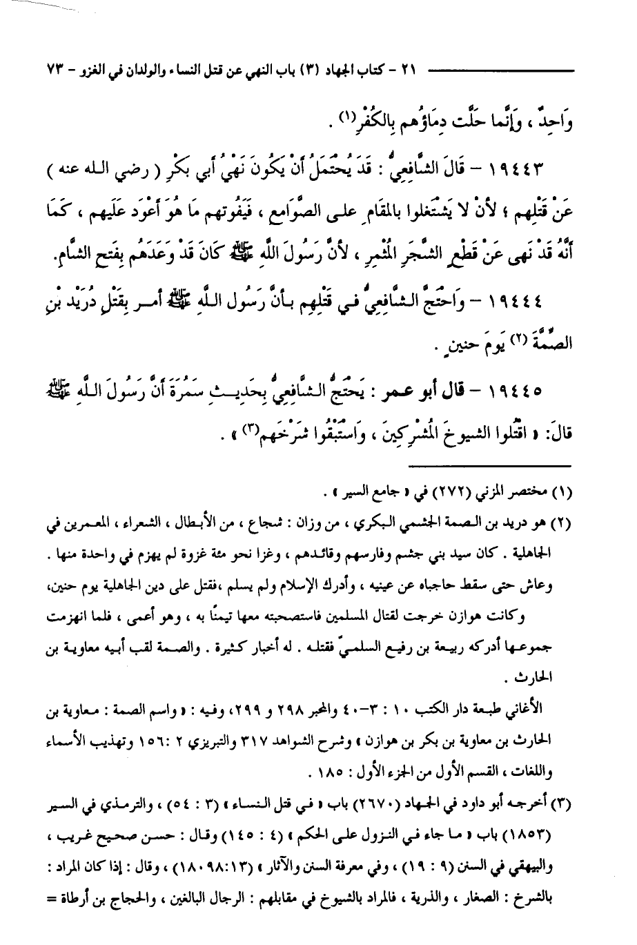 19444 - وَاحْتَجَّ الشَّافِعِيُّ فِي قَتْلِهِمْ بِأَنَّ رَسُولَ اللَّهِ - صَلَّى اللَّهُ عَلَيْهِ وَسَلَّمَ - أَمَرَ بِقَتْلِ دُرَيْدِ بْنِ الصِّمَّةِ يَوْمَ حُنَيْنٍ.