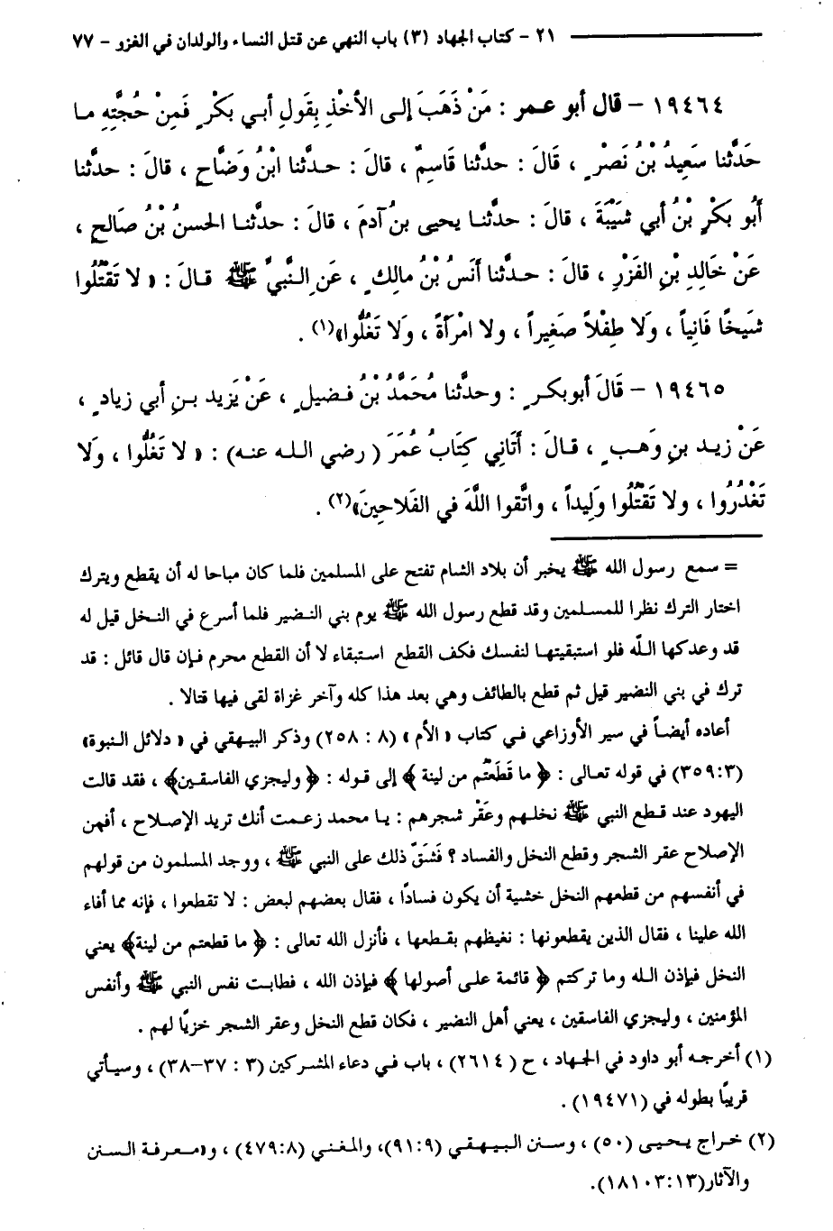 19464 - قَالَ أَبُو عُمَرَ: مَنْ ذَهَبَ إِلَى الْأَخْذِ بِقَوْلِ أَبِي بَكْرٍ فَمِنْ حُجَّتِهِ مَا حَدَّثَنَا سَعِيدُ بْنُ نَصْرٍ، قَالَ: حَدَّثَنَا قَاسِمٌ، قَالَ: حَدَّثَنَا ابْنُ وَضَّاحٍ، قَالَ: حَدَّثَنَا أَبُو بَكْرِ بْنُ أَبِي شَيْبَةَ، قَالَ: حَدَّثَنَا يَحْيَى بْنُ آدَمَ، قَالَ: حَدَّثَنَا الْحَسَنُ بْنُ صَالِحٍ، عَنْ خَالِدِ بْنِ الْفَزْرِ، قَالَ: حَدَّثَنَا أَنَسُ بْنُ مَالِكٍ، عَنِ النَّبِيِّ - صَلَّى اللَّهُ عَلَيْهِ وَسَلَّمَ - قَالَ: " لَا تَقْتُلُوا شَيْخًا فَانِيًا، وَلَا طِفْلًا صَغِيرًا، وَلَا امْرَأَةً، وَلَا تَغُلُّوا ".