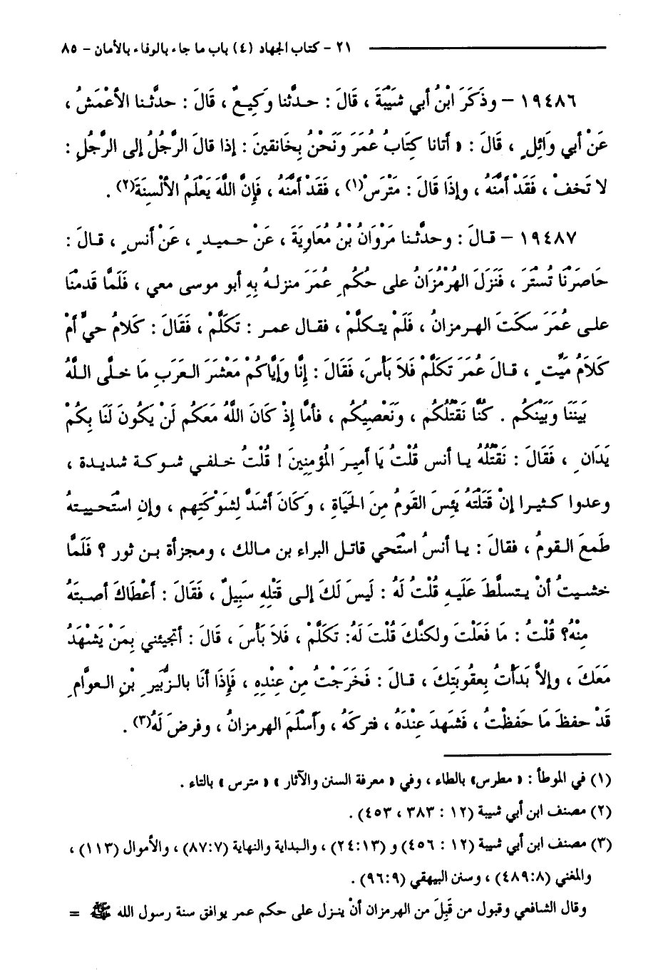 19487 - قَالَ: وَحَدَّثَنَا مَرْوَانُ بْنُ مُعَاوِيَةَ، عَنْ حُمَيْدٍ، عَنْ أَنَسٍ، قَالَ: حَاصَرْنَا تُسْتَرَ، فَنَزَلَ الْهُرْمُزَانُ عَلَى حُكْمِ عُمَرَ مُنْزِلُهُ بِهِ أَبُو مُوسَى مَعِي، فَلَمَّا قَدِمْنَا عَلَى عُمَرَ سَكَتَ الْهُرْمُزَانُ، فَلَمْ يَتَكَلَّمْ، فَقَالَ عُمَرُ: تَكَلَّمْ، فَقَالَ: كَلَامَ حَيٍّ أَمْ كَلَامَ مَيِّتٍ ؟ قَالَ عُمَرُ تَكَلَّمْ فَلَا بَأْسَ، فَقَالَ: إِنَّا وَإِيَّاكُمْ مَعْشَرَ الْعَرَبِ مَا خَلَّى اللَّهُ بَيْنَنَا وَبَيْنَكُمْ. كُنَّا نَقْتُلُكُمْ، وَنَعْصِيكُمْ، فَأَمَّا إِذْ كَانَ اللَّهُ مَعَكُمْ لَنْ يَكُونَ لَنَا بِكُمْ يَدَانِ، فَقَالَ: نَقْتُلُهُ يَا أَنَسُ قُلْتُ: يَا أَمِيرَ الْمُؤْمِنِينَ ! قُلْتُ: خَلْفِي شَوْكَةٌ شَدِيدَةٌ، وَعَدُوًّا كَثِيرًا إِنْ قَتَلْتَهُ يَئِسَ الْقَوْمُ مِنَ الْحَيَاةِ، وَكَانَ أَشَدَّ لِشَوْكَتِهِمْ، وَإِنِ اسْتَحْيَيْتَهُ طَمِعَ الْقَوْمُ، فَقَالَ: يَا أَنَسُ اسْتَحْيِي قَاتِلَ الْبَرَاءِ بْنِ مَالِكٍ، وَمَجْزَأَةَ بْنِ ثَوْرٍ ؟ فَلَمَّا خَشِيتُ أَنْ يَتَسَلَّطَ عَلَيْهِ قُلْتُ لَهُ: لَيْسَ لَكَ إِلَى قَتْلِهِ سَبِيلٌ، فَقَالَ: أَعْطَاكَ أَصَبْتَهُ مِنْهُ ؟ قُلْتُ: مَا فَعَلْتُ وَلَكِنَّكَ قُلْتَ لَهُ: تَكَلَّمْ، فَلَا بَأْسَ، قَالَ: أَتَجِيئُنِي بِمَنْ يَشْهَدُ مَعَكَ، وَإِلَّا بَدَأْتُ بِعُقُوبَتِكَ، قَالَ: فَخَرَجْتُ مِنْ عِنْدِهِ، فَإِذَا أَنَا بِالزُّبَيْرِ بْنِ الْعَوَّامِ قَدْ حَفِظَ مَا حَفِظْتُ، فَشَهِدَ عِنْدَهُ، فَتَرَكَهُ، وَأَسْلَمَ الْهُرْمُزَانُ، وَفَرَضَ لَهُ.