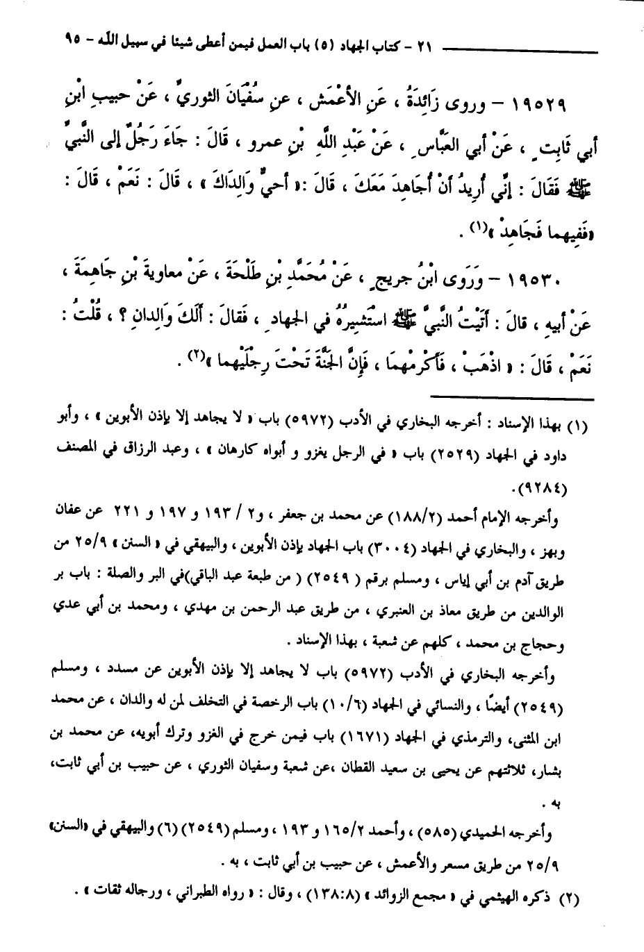 19529 - وَرَوَى زَائِدَةُ، عَنِ الْأَعْمَشِ، عَنْ سُفْيَانَ الثَّوْرِيِّ، عَنْ حَبِيبِ بْنِ أَبِي ثَابِتٍ، عَنْ أَبِي الْعَبَّاسِ، عَنْ عَبْدِ اللَّهِ بْنِ عُمَرَ، قَالَ: جَاءَ رَجُلٌ إِلَى النَّبِيِّ - صَلَّى اللَّهُ عَلَيْهِ وَسَلَّمَ - فَقَالَ: إِنِّي أُرِيدُ أَنْ أُجَاهِدَ مَعَكَ، قَالَ: " أَحَيٌّ وَالِدَاكَ "، قَالَ: نَعَمْ، قَالَ: " فَفِيهِمَا فَجَاهِدْ ".