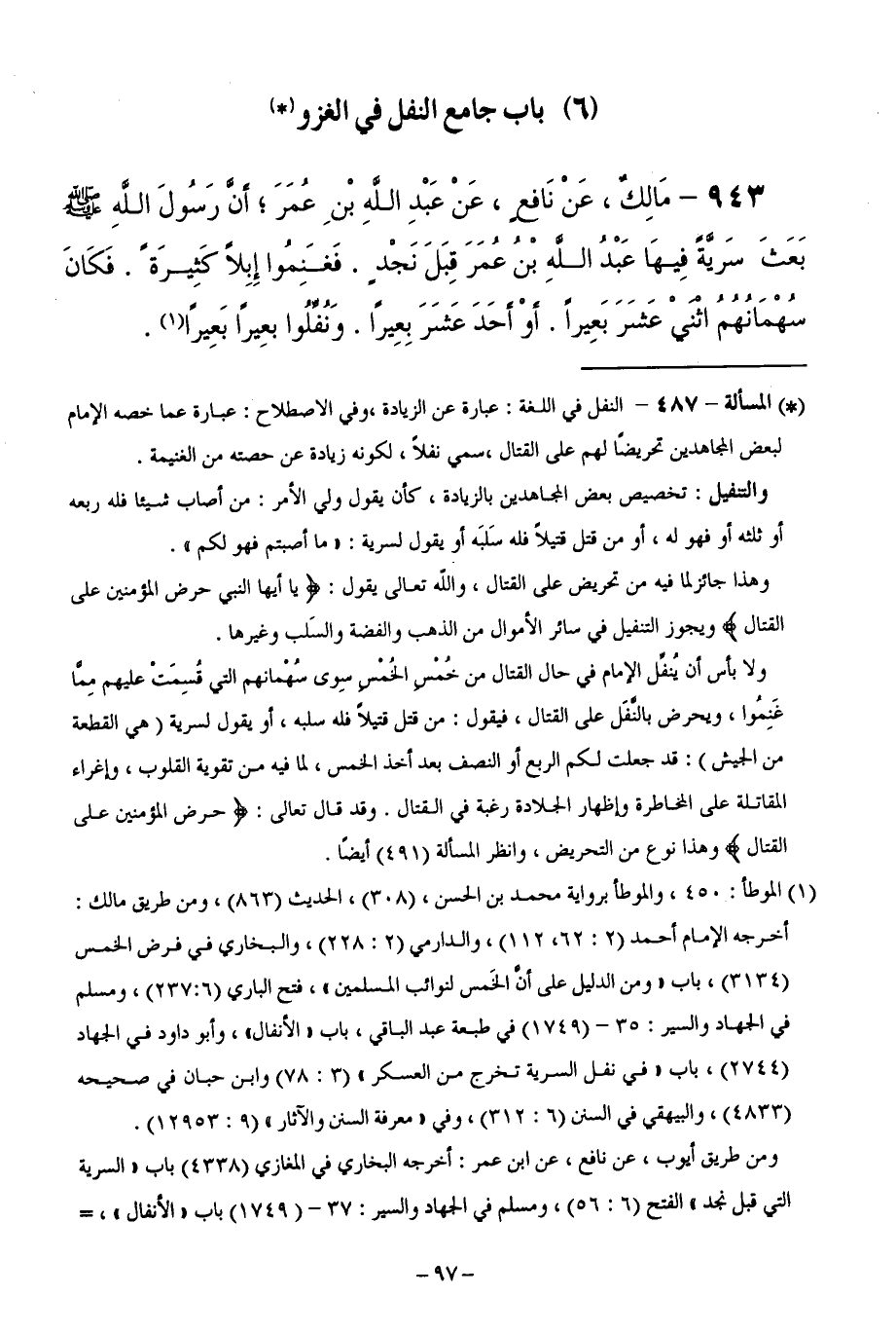 943 - مَالِكٌ، عَنْ نَافِعٍ، عَنْ عَبْدِ اللَّهِ بْنِ عُمَرَ ؛ أَنَّ رَسُولَ اللَّهِ - صَلَّى اللَّهُ عَلَيْهِ وَسَلَّمَ -، بَعَثَ سَرِيَّةَ فِيهَا عَبْدُ اللَّهِ بْنُ عُمَرَ قِبَلَ نَجْدٍ. فَغَنِمُوا إِبِلًا كَثِيرَةً، فَكَانَ سُهْمَانُهُمُ اثْنَيْ عَشَرَ بَعِيرًا، أَوْ أَحَدَ عَشَرَ بَعِيرًا. وَنُفِّلُوا بَعِيرًا بَعِيرًا.