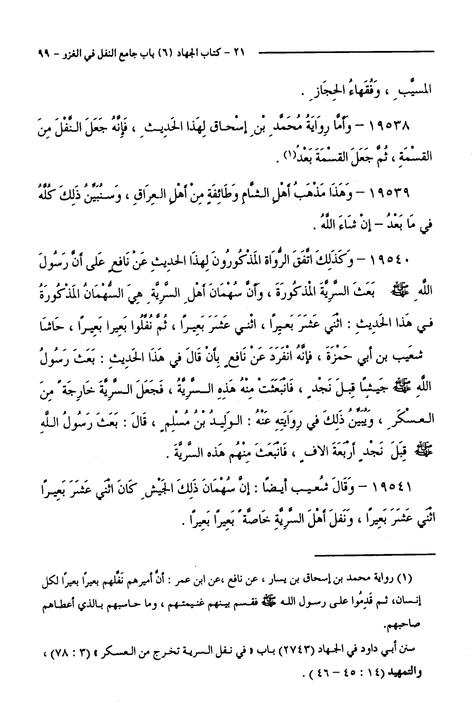 19538 - وَأَمَّا رِوَايَةُ مُحَمَّدِ بْنِ إِسْحَاقَ لِهَذَا الْحَدِيثِ، فَإِنَّهُ جَعَلَ النَّفْلَ مِنَ الْقِسْمَةِ، ثُمَّ جَعَلَ الْقِسْمَةَ بَعْدُ.