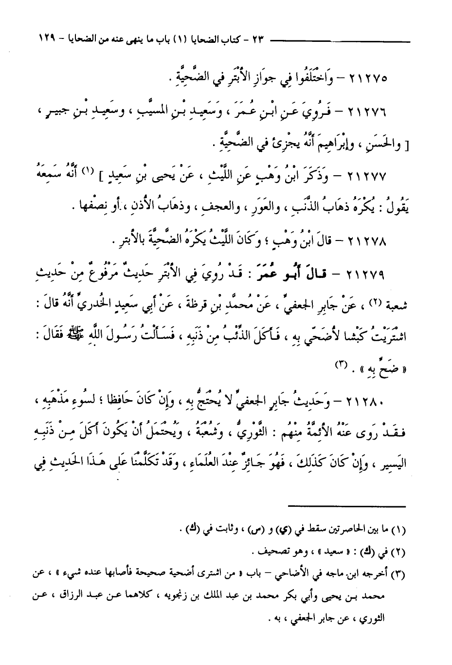 21276 - فَرُوِيَ عَنِ ابْنِ عُمَرَ، وَسَعِيدِ بْنِ الْمُسَيِّبِ، وَسَعِيدِ بْنِ جُبَيْرٍ، وَالْحَسَنِ، وَإِبْرَاهِيمَ أَنَّهُ يُجْزِئُ فِي الضَّحِيَّةِ.