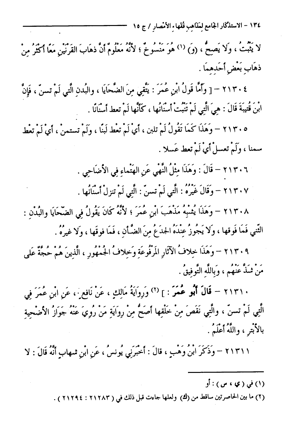 21304 - وَأَمَّا قَوْلُ ابْنِ عُمَرَ: يُتَّقَى مِنَ الضَّحَايَا، وَالْبُدْنِ الَّتِي لَمْ تُسِنَّ، فَإِنَّ ابْنَ قُتَيْبَةَ قَالَ: هِيَ الَّتِي لَمْ تَنْبُتَ أَسْنَانُهَا، كَأَنَّهَا لَمْ تُعْطَ أَسْنَانًا.