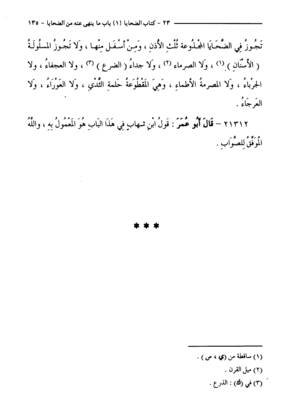 تَجُوزُ فِي الضَّحَايَا الْمَجْذُوعَةِ ثُلُثِ الْأُذُنِ وَمِنْ أَسْفَلَ مِنْهَا، وَلَا تَجُوزُ الْمَسْلُولَةُ الْأَسْنَانِ، وَلَا الصَّرْمَاءِ، وَلَا جَدَّاءُ الضَّرْعِ، وَلَا الْعَجْفَاءُ، وَلَا الْجَرْبَاءُ، وَلَا الْمُصَرَّمَةُ الْأَطْمَاءِ، وَهِيَ الْمَقْطُوَعَةُ حَلَمَةُ الثَّدْيِ، وَلَا الْعَوْرَاءُ، وَلَا الَعَرْجَاءُ.