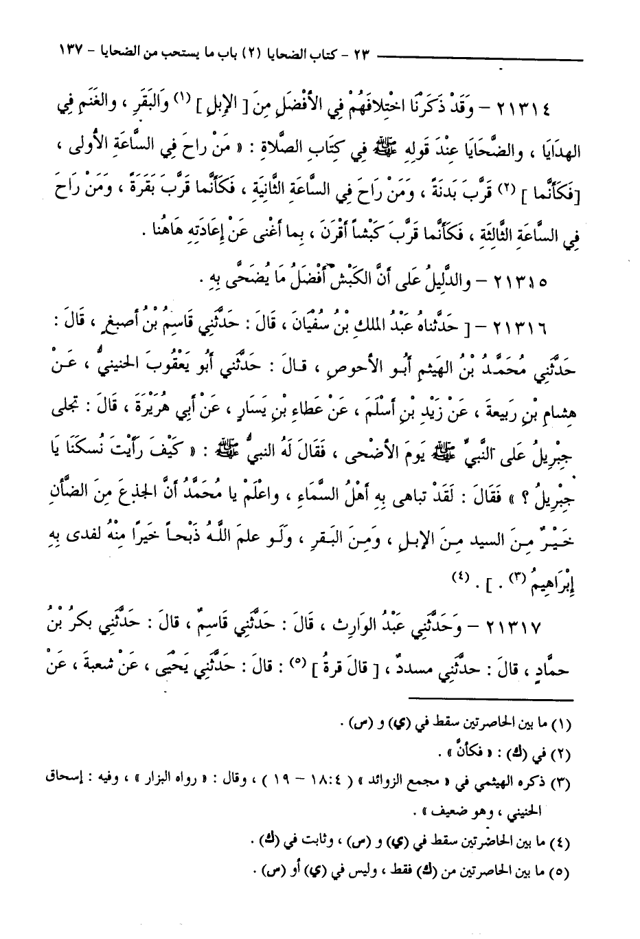 21316 - وَحَدَّثَنَاهُ عَبْدُ الْمَلِكِ بْنُ سُفْيَانَ، قَالَ: حَدَّثَنِي قَاسِمُ بْنُ أَصْبَغَ، قَالَ: حَدَّثَنِي مُحَمَّدُ بْنُ الْهَيْثَمِ أَبُو الْأَحْوَصِ، قَالَ: حَدَّثَنِي أَبُو يَعْقُوبَ الْحُنَيْنِيُّ، عَنْ هِشَامِ بْنِ رَبِيعَةَ، عَنْ زَيْدِ بْنِ أَسْلَمَ، عَنْ عَطَاءِ بْنِ يَسَارٍ، عَنْ أَبِي هُرَيْرَةَ، قَالَ: تَجَلَّى جِبْرِيلُ عَلَى النَّبِيِّ - صَلَّى اللَّهُ عَلَيْهِ وَسَلَّمَ - يَوْمَ الْأَضْحَى، فَقَالَ لَهُ النَّبِيُّ - صَلَّى اللَّهُ عَلَيْهِ وَسَلَّمَ -: كَيْفَ رَأَيْتَ نُسُكَنَا يَا جِبْرِيلُ ؟ فَقَالَ: لَقَدْ تَبَاهَى بِهِ أَهْلُ السَّمَاءِ، وَاعْلَمْ يَا مُحَمَّدُ أَنَّ الْجَذَعَ مِنَ الضَّأْنِ خَيْرٌ مِنَ السَّيِّدِ مِنَ الْإِبِلِ، وَمِنَ الْبَقَرِ، وَلَوْ عَلِمَ اللَّهُ ذَبْحًا خَيْرًا مِنْهُ لَفَدَى بِهِ إِبْرَاهِيمُ.