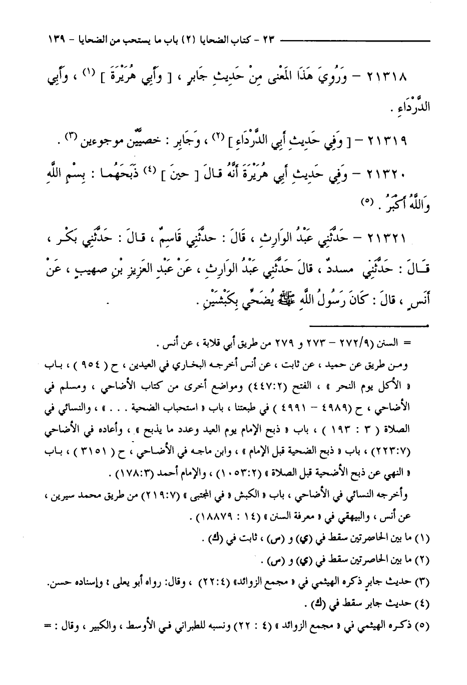 21320 - وَفِي حَدِيثِ أَبِي هُرَيْرَةَ أَنَّهُ قَالَ حِينَ ذَبَحَهُمَا: بِسْمِ اللَّهِ وَاللَّهُ أَكْبَرُ.