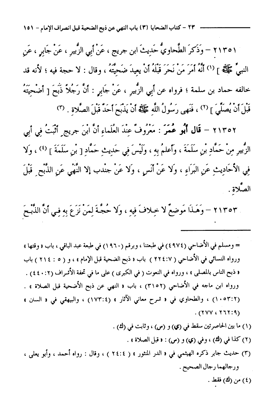 21351 - وَذَكَرَ الطَّحَاوِيُّ حَدِيثَ ابْنِ جُرَيْجٍ، عَنْ أَبِي الزُّبَيْرِ، عَنْ جَابِرٍ، عَنِ النَّبِيِّ - صَلَّى اللَّهُ عَلَيْهِ وَسَلَّمَ -، أَنَّهُ أَمَرَ مَنْ نَحَرَ قَبْلَهُ أَنْ يُعِيدَ ضَحِيَّتَهُ، وَقَالَ: لَا حُجَّةَ فِيهِ ؟ لِأَنَّهُ قَدْ خَالَفَهُ حَمَّادُ بْنُ سَلَمَةَ ؟ فَرَوَاهُ عَنْ أَبِي الزُّبَيْرِ، عَنْ جَابِرٍ: أَنْ رَجُلًا ذَبَحَ أُضْحِيَّتَهُ قَبِلَ أَنْ يُصَلِّيَ، فَنَهَى رَسُولُ اللَّهِ - صَلَّى اللَّهُ عَلَيْهِ وَسِلْمِ - أَنْ يَذْبَحَ أَحَدٌ قَبْلَ الصَّلَاةِ.
