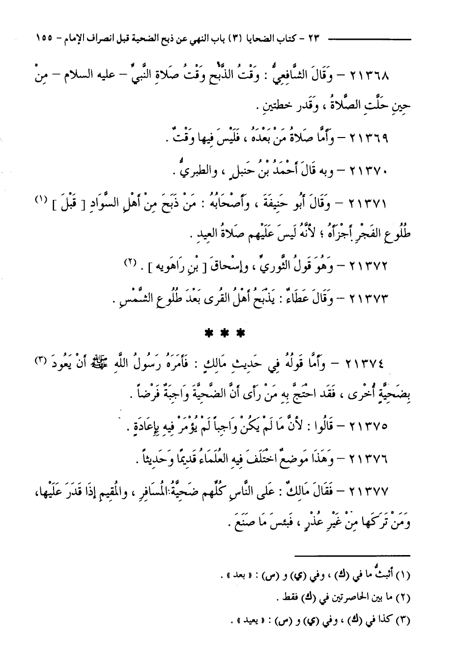 21371 - وَقَالَ أَبُو حَنِيفَةَ، وَأَصْحَابُهُ: مَنْ ذَبَحَ مِنْ أَهْلِ السَّوَادِ قَبِلَ طُلُوعِ الْفَجْرِ أَجْزَأَهُ لِأَنَّهُ لَيْسَ عَلَيْهِمْ صَلَاةُ الْعِيدِ.