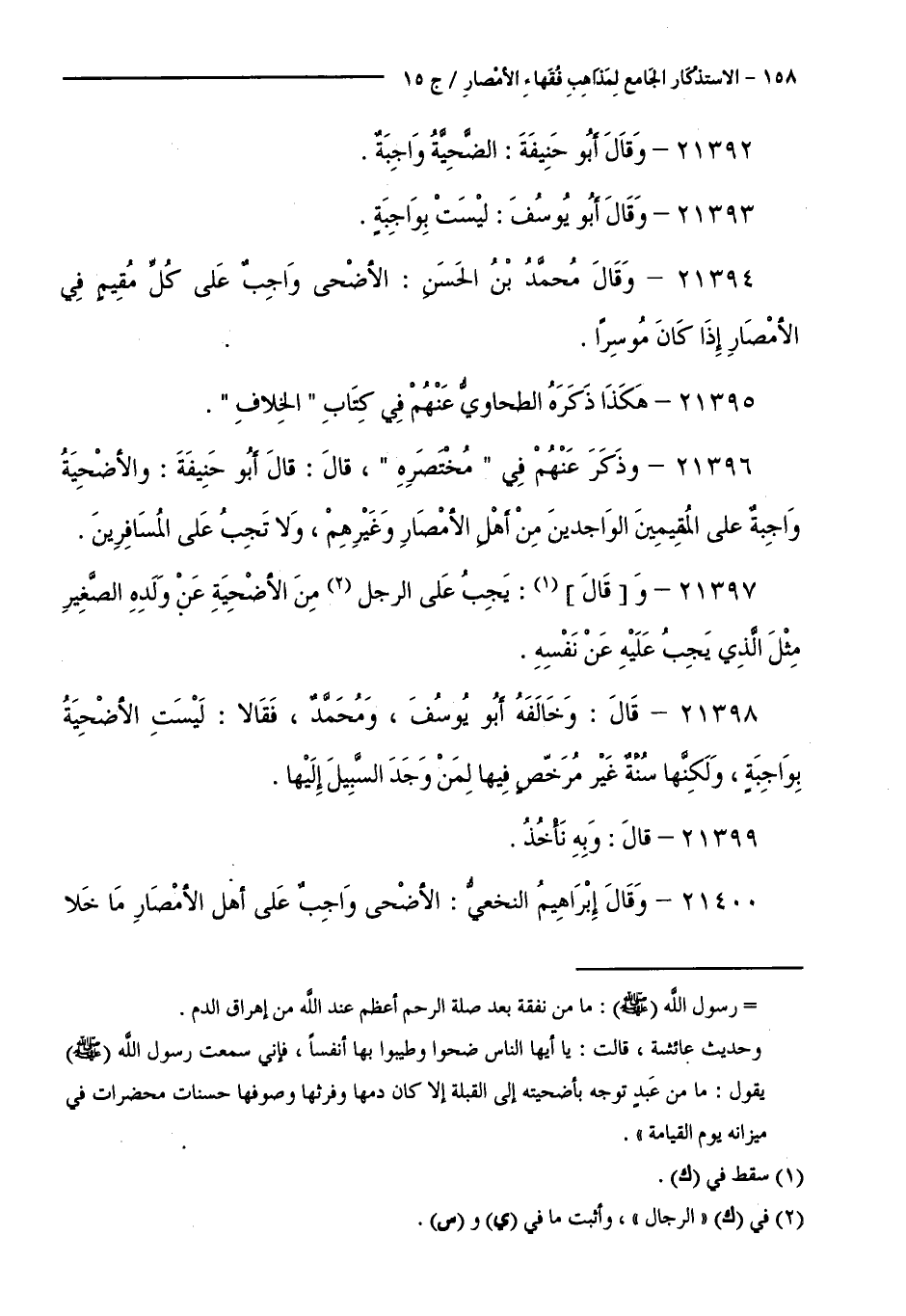21396 - وَذَكَرَ عَنْهُمْ فِي " مُخْتَصَرِهِ "، قَالَ: قَالَ أَبُو حَنِيفَةَ: وَالْأُضْحِيَّةُ وَاجِبَةٌ عَلَى الْمُقِيمِينَ الْوَاجِدِينَ مِنْ أَهْلِ الْأَمْصَارِ وَغَيْرِهِمْ، وَلَا تَجِبُ عَلَى الْمُسَافِرِينَ.