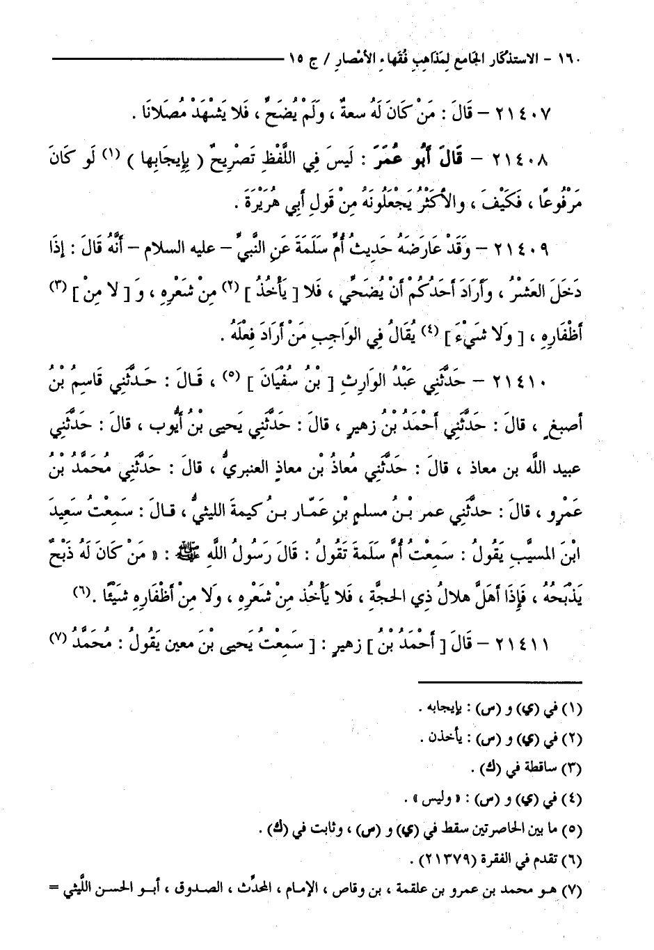 21410 - حَدَّثَنِي عَبْدُ الْوَارِثِ بْنُ سُفْيَانَ، قَالَ: حَدَّثَنِي قَاسِمُ بْنُ أَصْبَغَ، قَالَ: حَدَّثَنِي أَحْمَدُ بْنُ زُهَيْرٍ، قَالَ: حَدَّثَنِي يَحْيَى بْنُ أَيُّوبَ، قَالَ: حَدَّثَنِي عُبَيْدُ اللَّهِ بْنُ مُعَاذٍ، قَالَ: حَدَّثَنِي مُعَاذُ بْنُ مُعَاذٍ الْعَنْبَرِيُّ، قَالَ: حَدَّثَنِي مُحَمَّدُ بْنُ عَمْرٍو، قَالَ: حَدَّثَنِي عُمَرُ بْنُ مُسْلِمِ بْنِ عَمَّارِ بْنِ أُكَيْمَةَ اللَّيْثِيُّ، قَالَ: سَمِعَتْ سَعِيدَ بْنَ الْمُسَيِّبِ يَقُولُ: سَمِعْتُ أُمَّ سَلَمَةَ تَقُولُ: قَالَ رَسُولُ اللَّهِ - صَلَّى اللَّهُ عَلَيْهِ وَسِلْمِ -: مَنْ كَانَ لَهُ ذِبْحٌ يَذْبَحُهُ، فَإِذَا أَهَلَّ هِلَالُ ذِي الْحِجَّةِ فَلَا يَأْخُذْ مِنْ شَعْرِهِ، وَلَا مِنْ أَظْفَارِهِ شَيْئًا.
