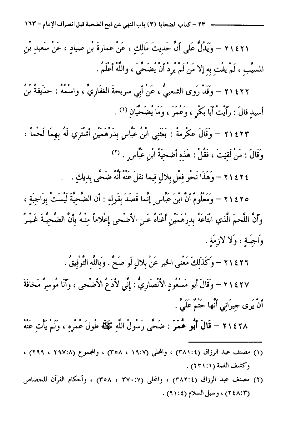 21425 - وَمَعْلُومٌ أَنَّ ابْنَ عَبَّاسٍ إِنَّمَا قَصَدَ بِقَوْلِهِ: أَنَّ الضَّحِيَّةَ لَيْسَتْ بِوَاجِبَةٍ، وَأَنَّ اللَّحْمَ الَّذِي ابْتَاعَهُ بِدِرْهَمَيْنِ أَغْنَاهُ عَنِ الْأَضْحَى إِعْلَامًا مِنْهُ بِأَنَّ الضَّحِيَّةَ غَيْرُ وَاجِبَةٍ، وَلَا لَازِمَةٍ.